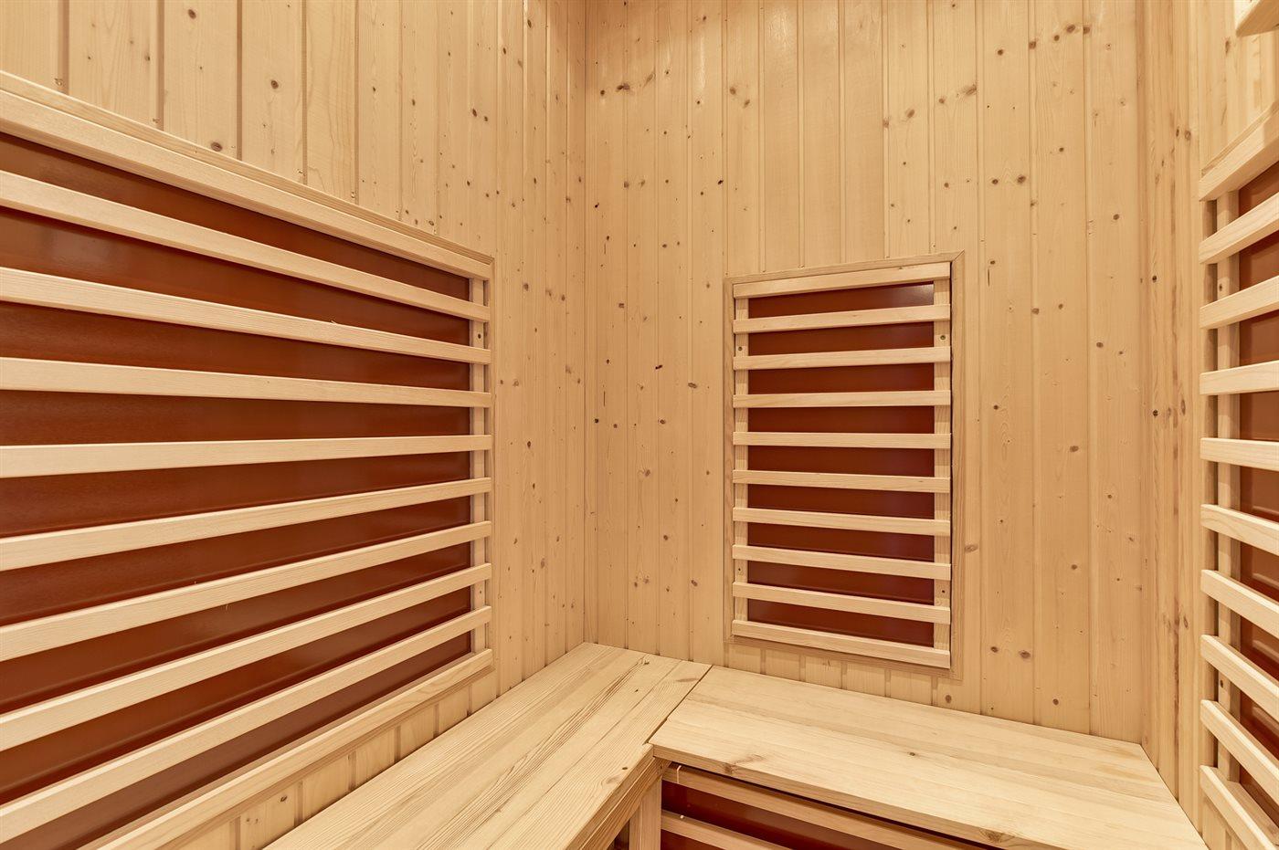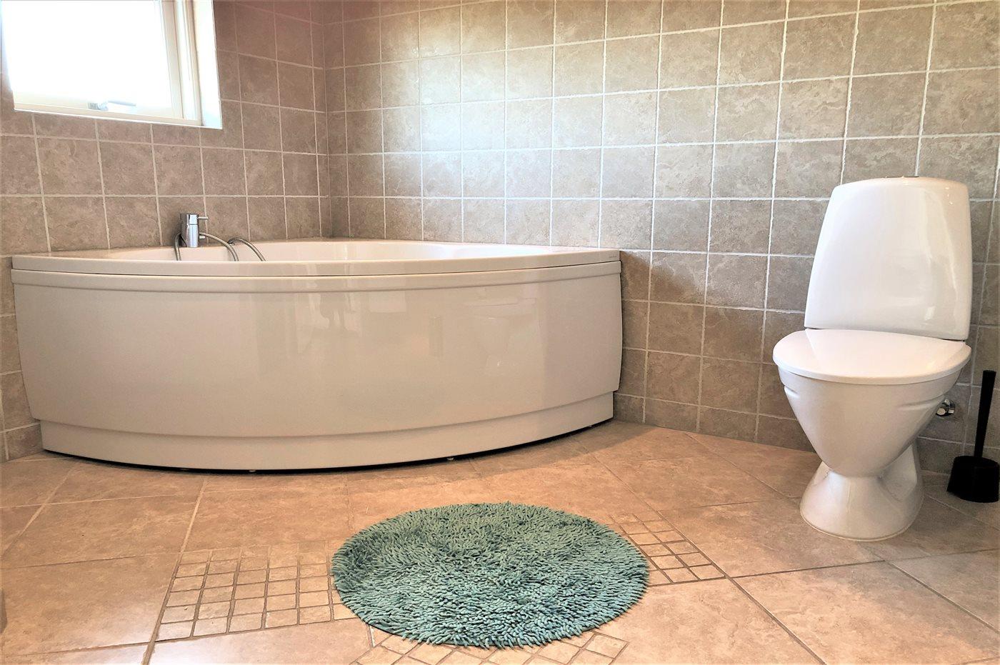 Der er 2 badeværelser med gulvvarme; 1 med bruseniche og 1 med badekar. Infrarød helsekabine.
