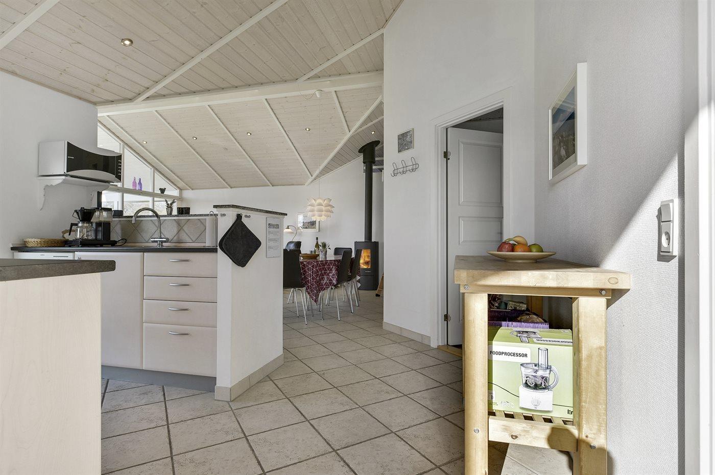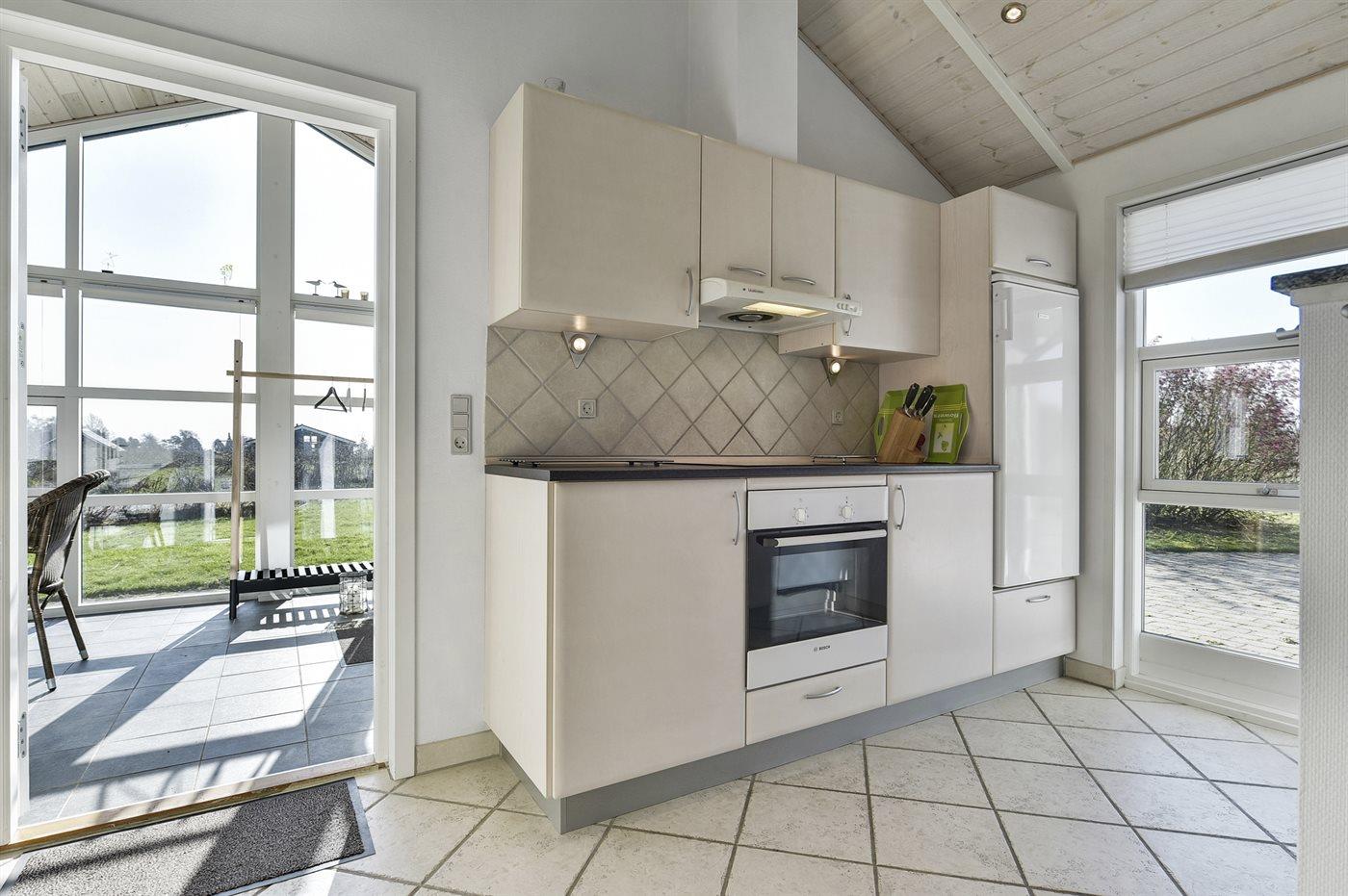 Køkkenet er udstyret med 1 køleskab. Der er 4 keramiske kogeplader, bageovn, mikrobølgeovn samt opvaskemaskine.