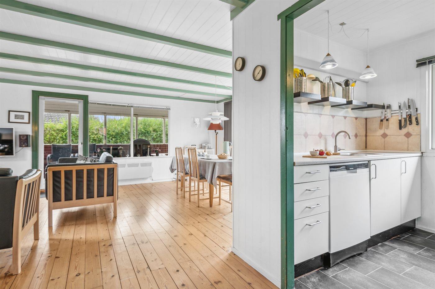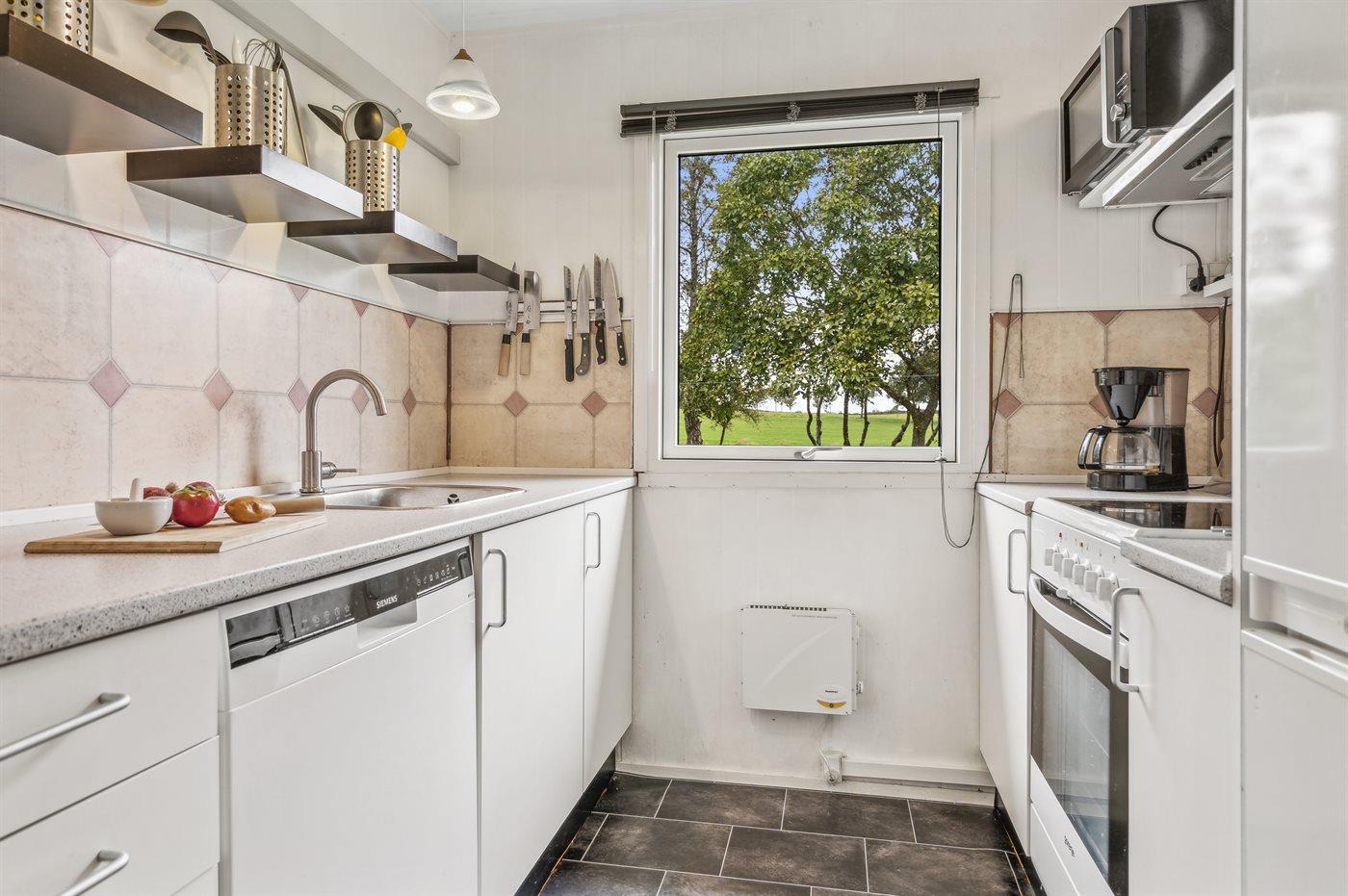 Køkkenet er udstyret med 1 køleskab. Der er 4 keramiske kogeplader, varmluftovn, mikrobølgeovn samt opvaskemaskine.