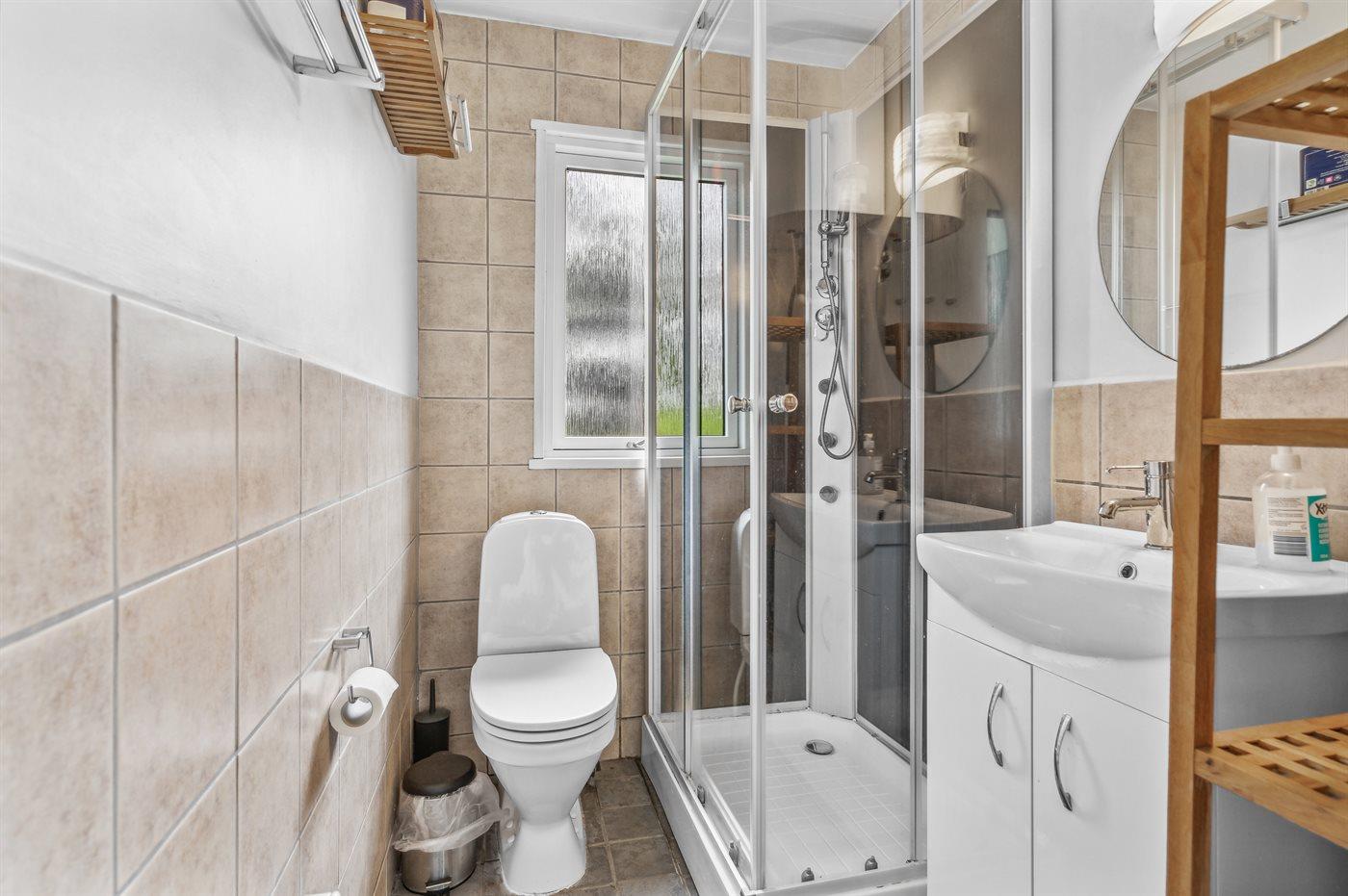 Der er 1 badeværelse med bruseniche og 2 toiletter, heraf 1 gæstetoilet. Der er gulvvarme på 1 badeværelse.