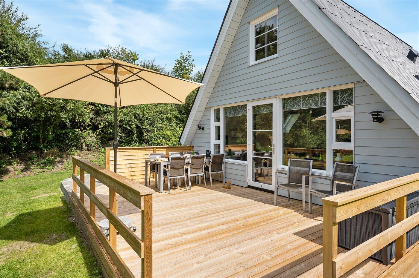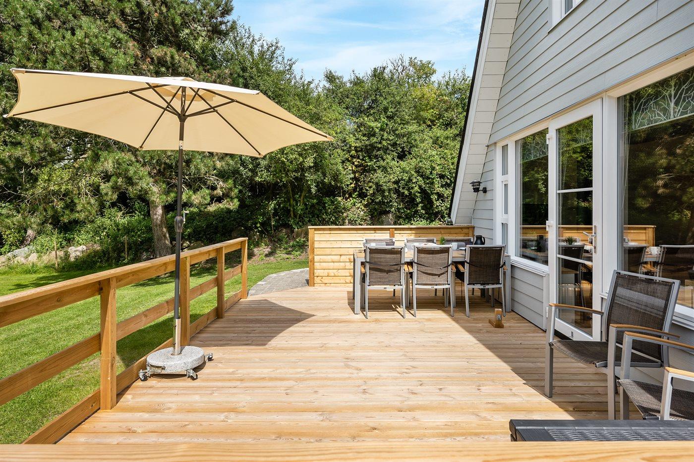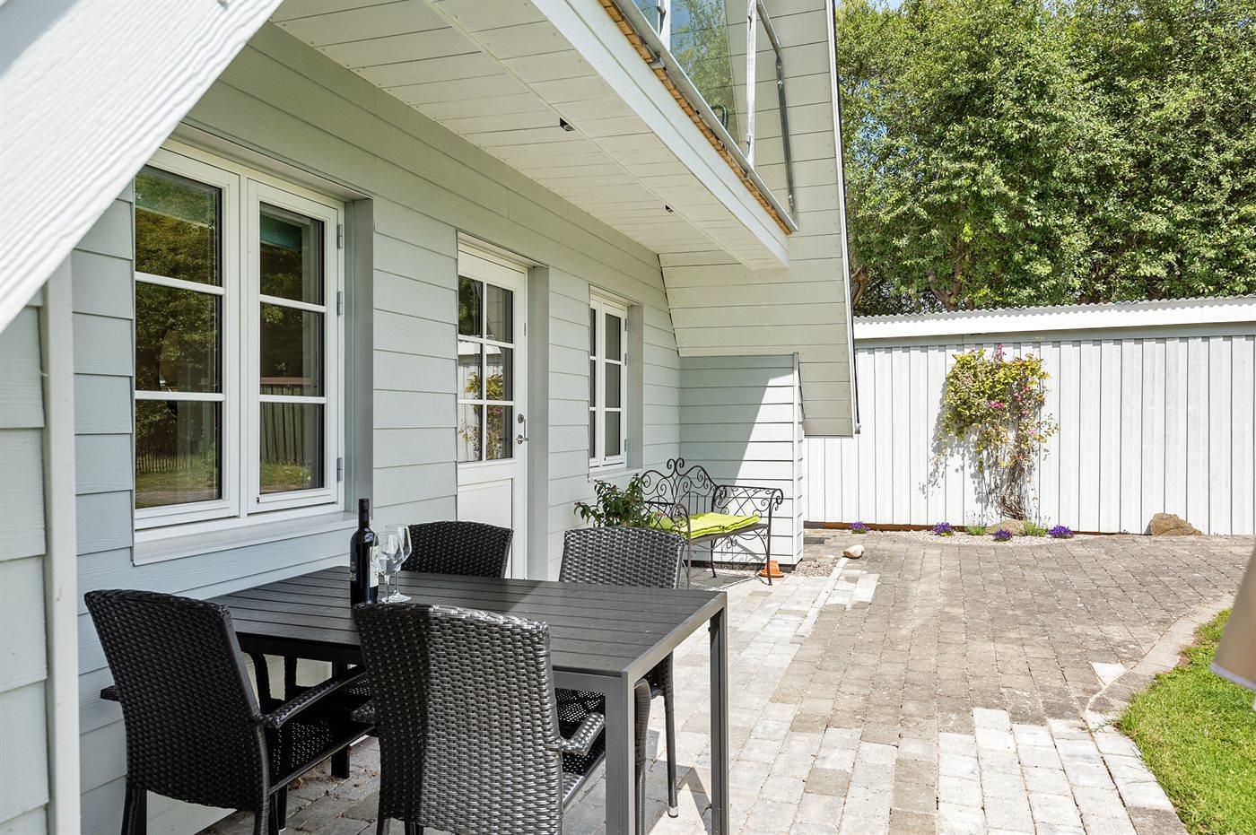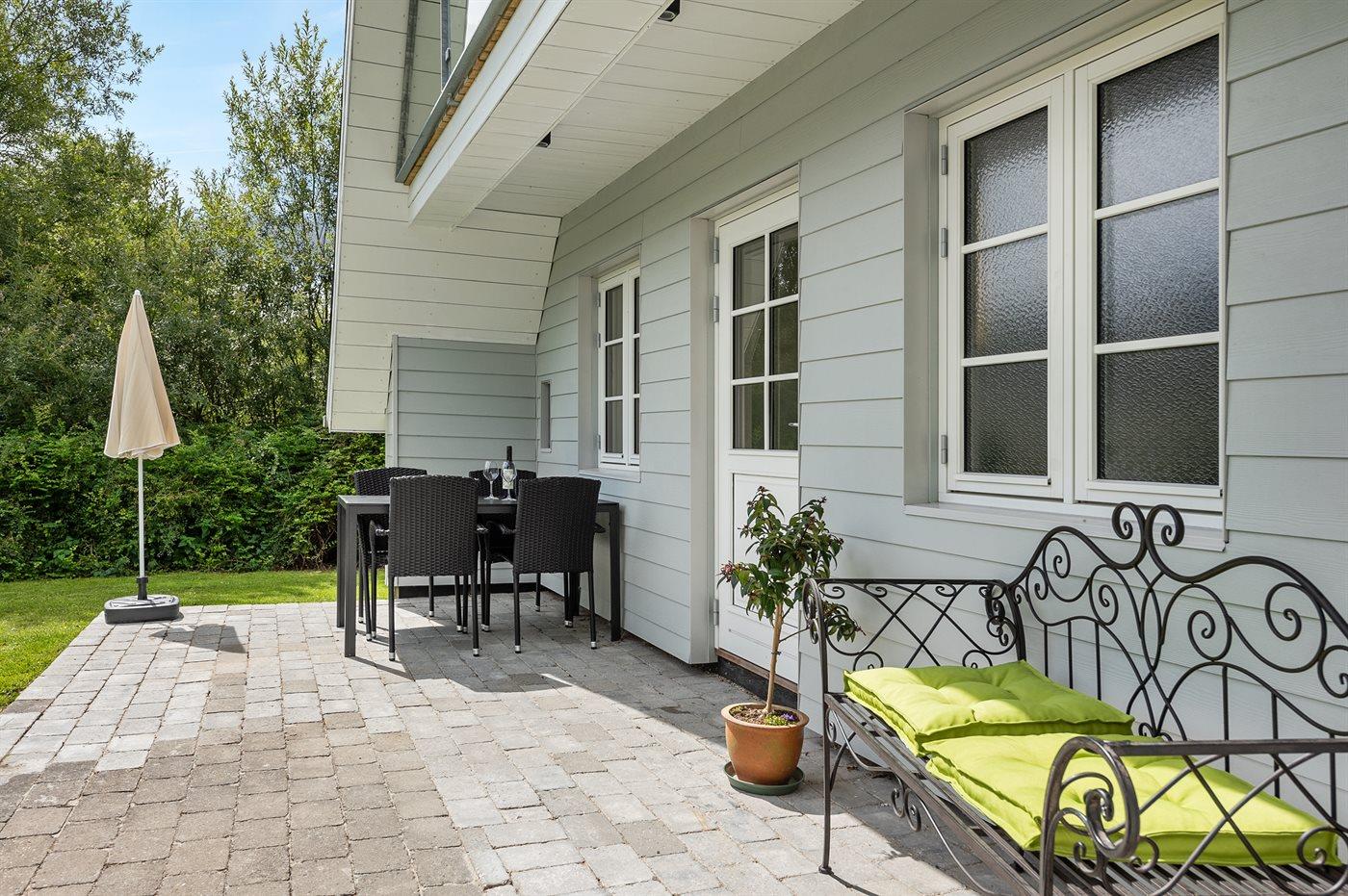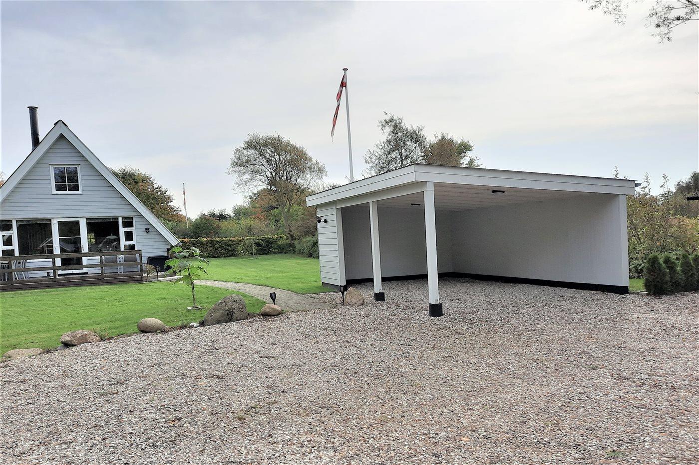 Ferieboligen er beliggende på en 1232 m² stor havegrund. Der er 350 m til havet. Der er en badebro i nærheden. Nærmeste forretning er beliggende i en afstand af 7000 m. Der er en golfbane i en afstand af 900 m. Til ferieboligen hører 61 m² terrasseareal. Desuden er der 9 m² overdækket terrasse. Udgang til altan. Der er redskabsrum. Bålsted. Der er 2 grill til rådighed. Der er 1 kuglegrill og 1 gasgrill til rådighed. Der er carport til rådighed. Parkering ved ferieboligen.