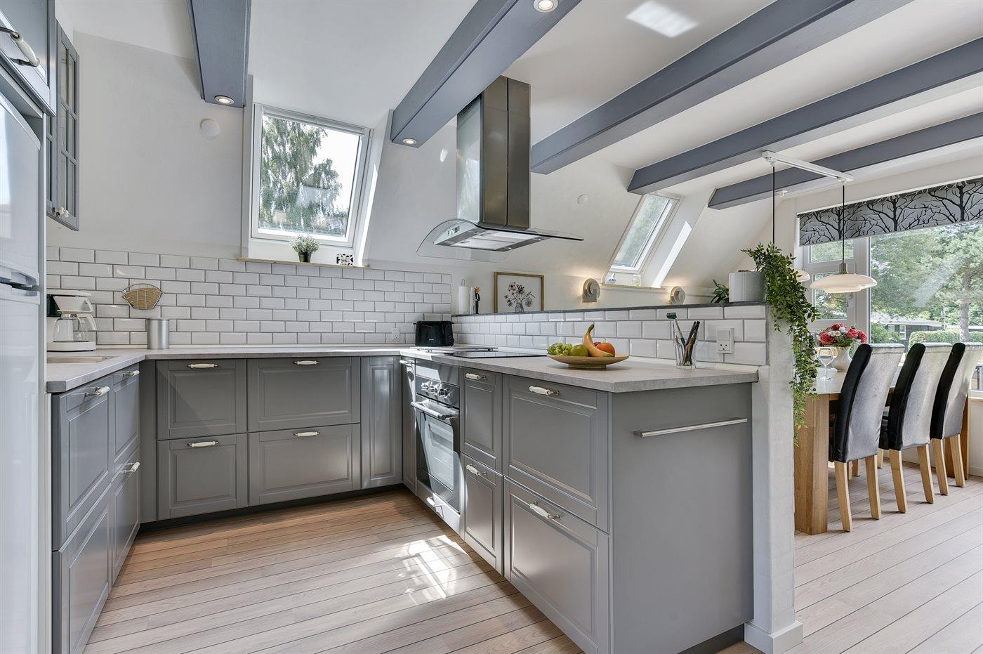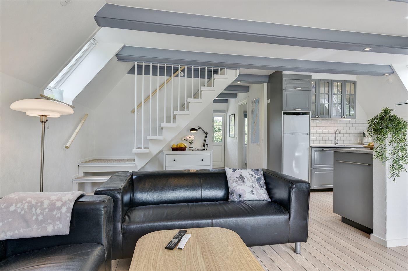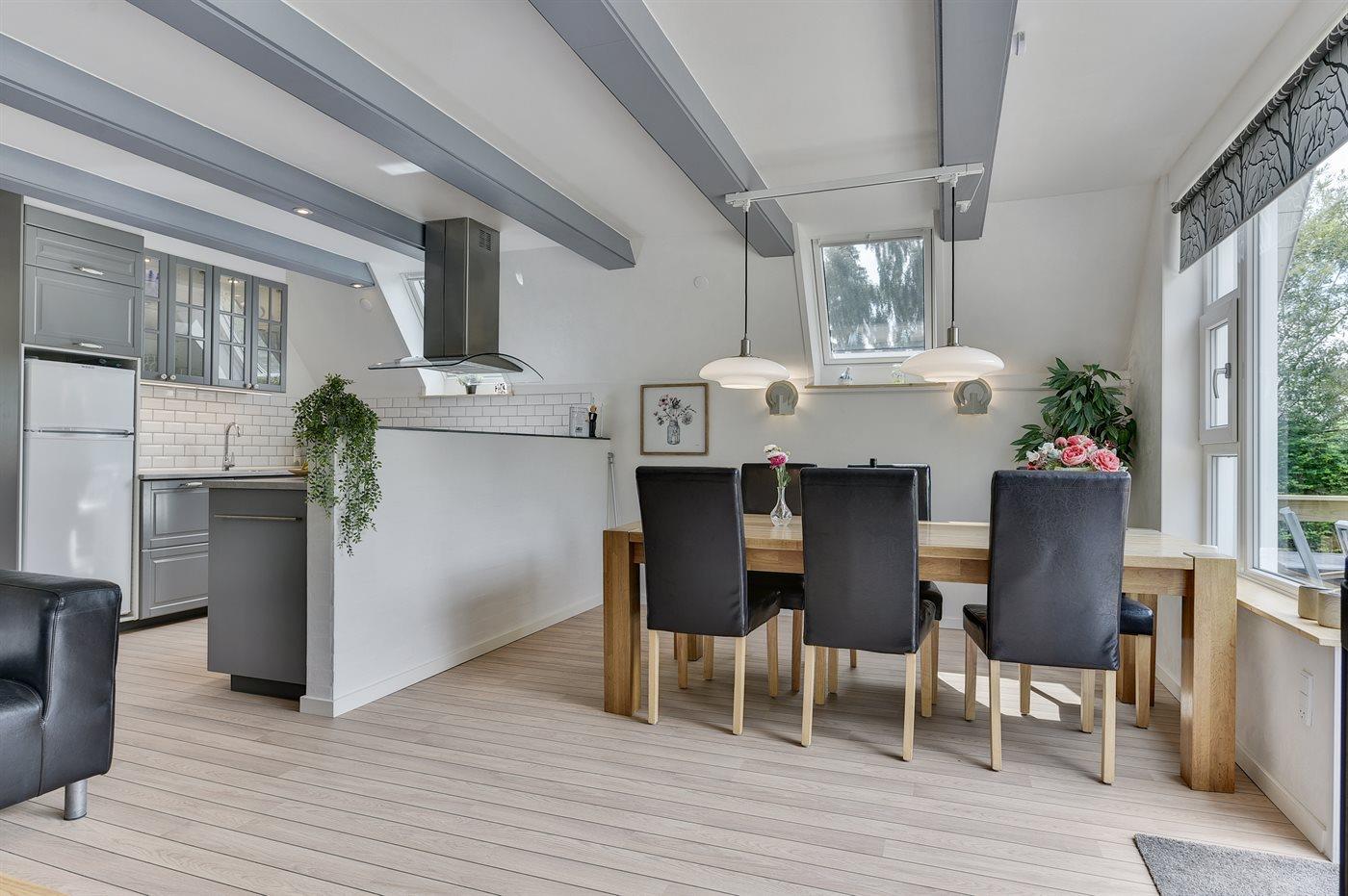 Køkkenet er udstyret med 1 køleskab. Der er 4 induktionskogeplader, varmluftovn, mikrobølgeovn samt opvaskemaskine.