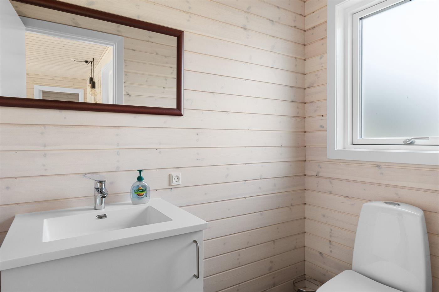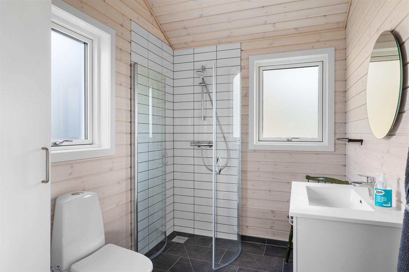 Der er 1 badeværelse med bruseniche og 2 toiletter, heraf 1 gæstetoilet. Der er gulvvarme på 1 badeværelse. Der er gulvvarme på gæstetoilettet.