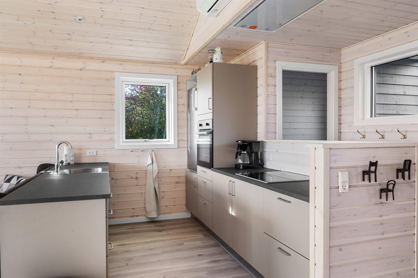 Køkkenet er udstyret med 1 køleskab. Der er 4 induktionskogeplader, varmluftovn, mikrobølgeovn samt opvaskemaskine.