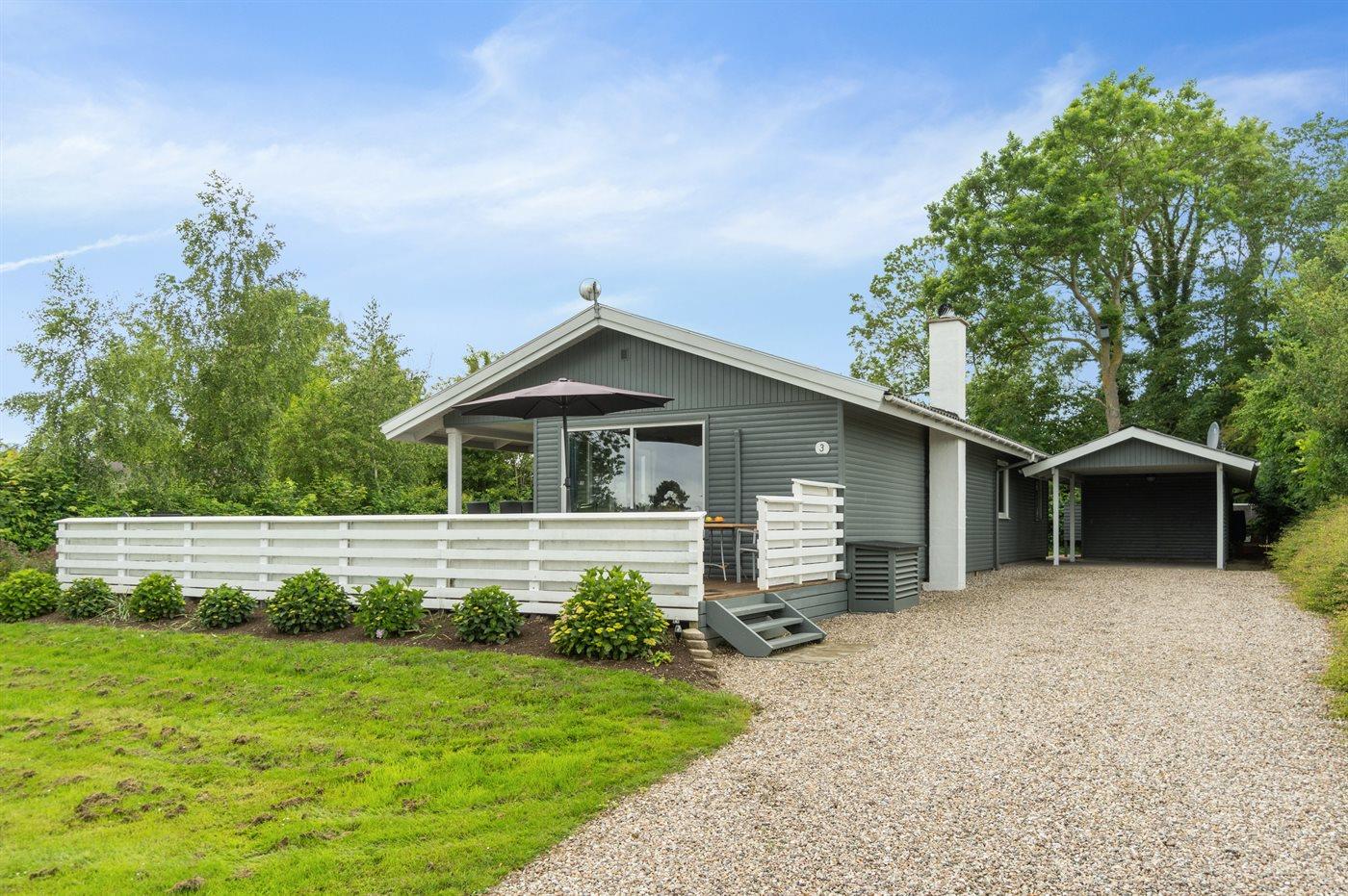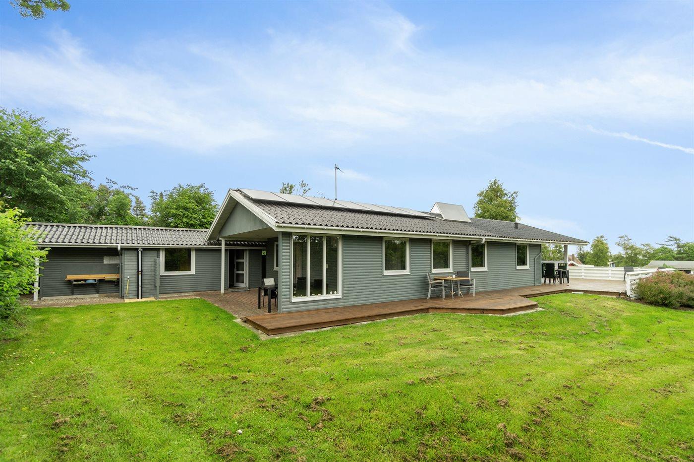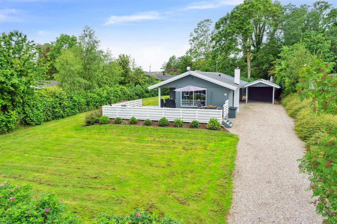 Ferieboligen er beliggende på en 1241 m² stor havegrund. Der er 300 m til havet. Der er en sø i en afstand af 700 m. Der er en badebro i nærheden. Nærmeste forretning er beliggende i en afstand af 4900 m. Der er en golfbane i en afstand af 400 m. Til ferieboligen hører åbent terrasseareal. Desuden er der overdækket terrasse. Legehus. Der ligger en legeplads i en afstand af 320 m. Udendørs bruser. Grill til rådighed. Der er carport til rådighed. Der er installeret stik til opladning af elbil. Type 2 stik. Med 11 kW ladeeffekt. Parkering ved ferieboligen.