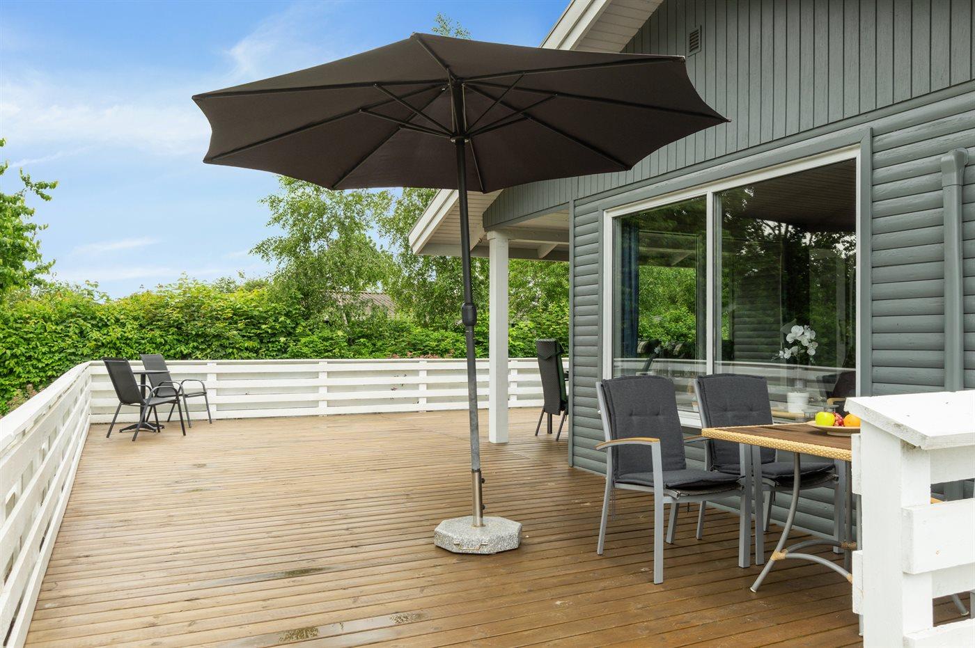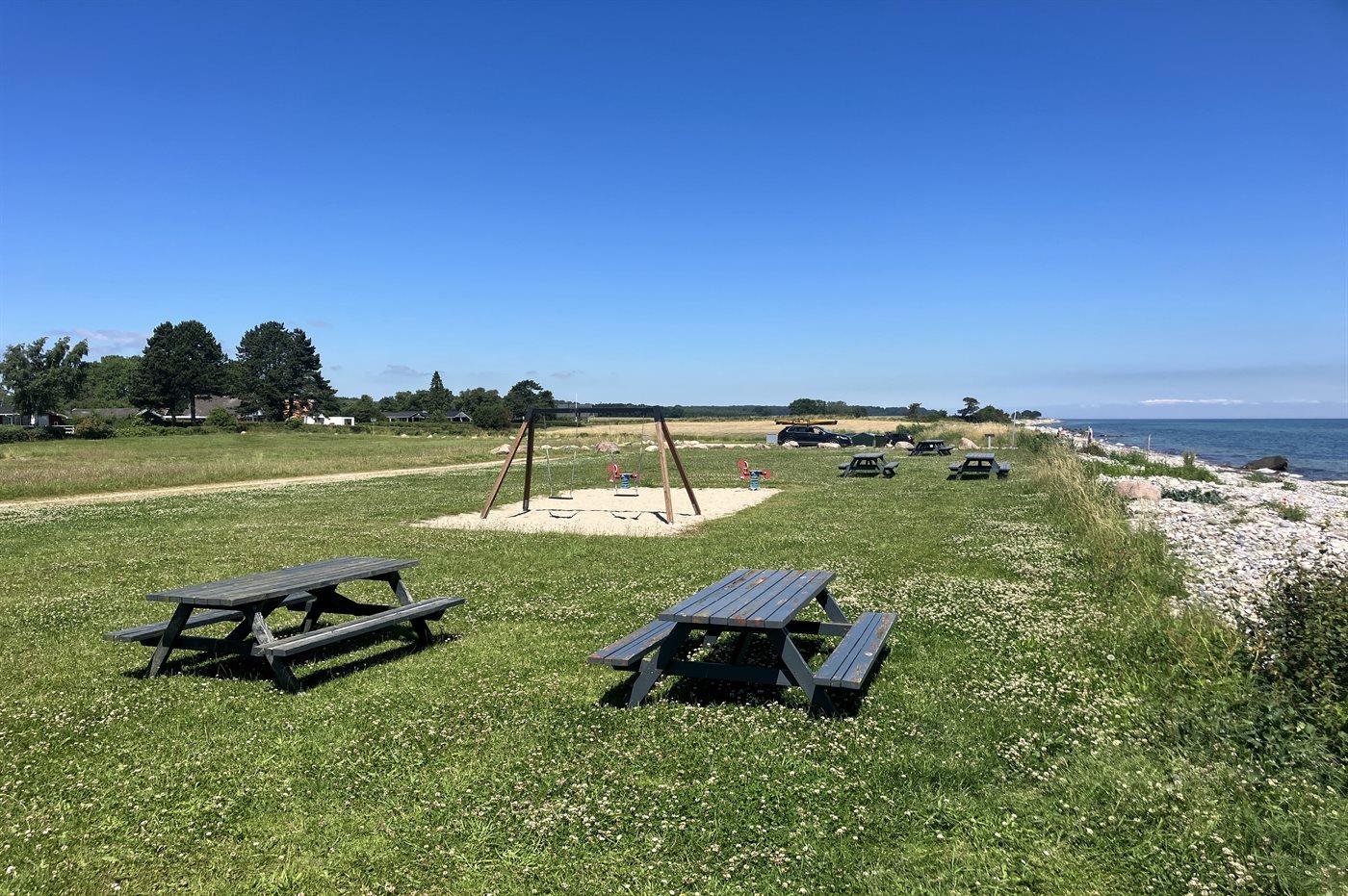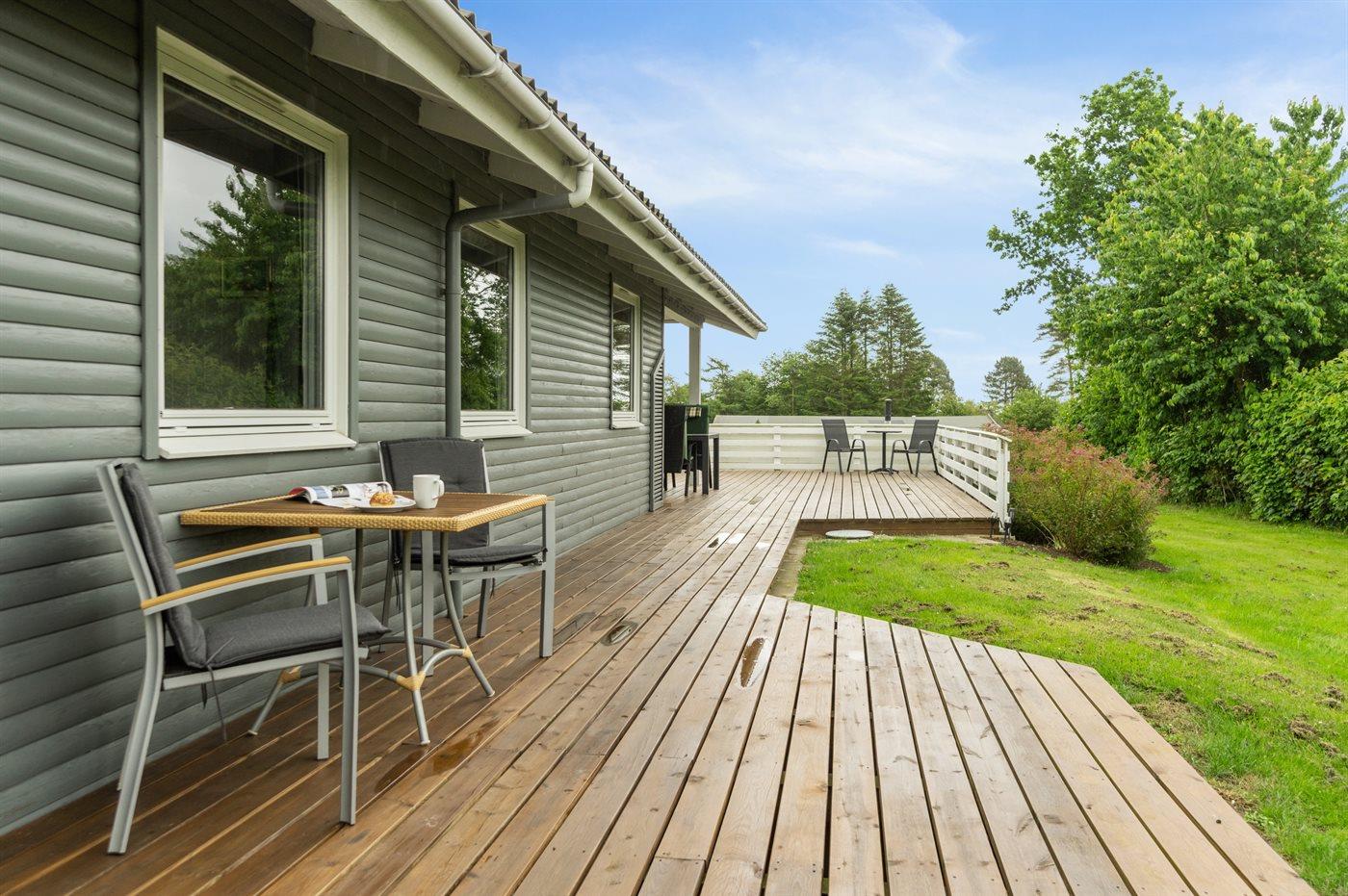 Ferieboligen er beliggende på en 1241 m² stor havegrund. Der er 300 m til havet. Der er en sø i en afstand af 700 m. Der er en badebro i nærheden. Nærmeste forretning er beliggende i en afstand af 4900 m. Der er en golfbane i en afstand af 400 m. Til ferieboligen hører åbent terrasseareal. Desuden er der overdækket terrasse. Legehus. Der ligger en legeplads i en afstand af 320 m. Udendørs bruser. Grill til rådighed. Der er carport til rådighed. Der er installeret stik til opladning af elbil. Type 2 stik. Med 11 kW ladeeffekt. Parkering ved ferieboligen.