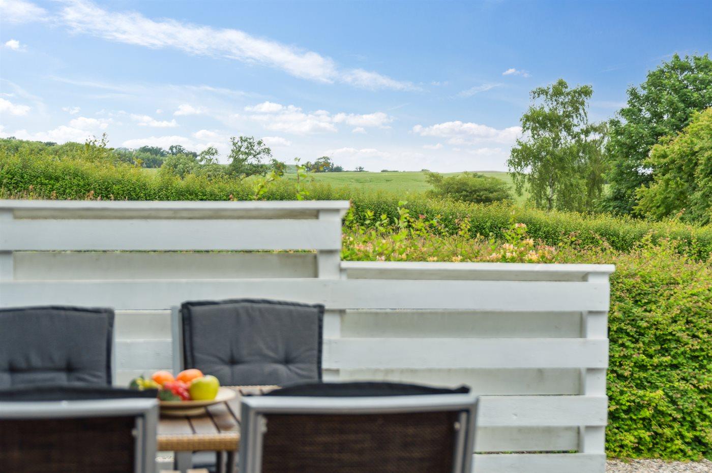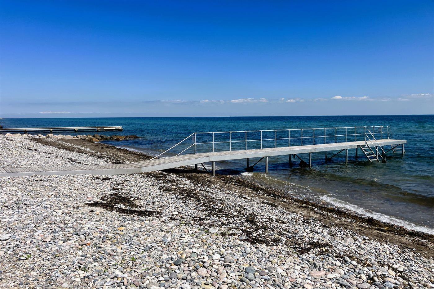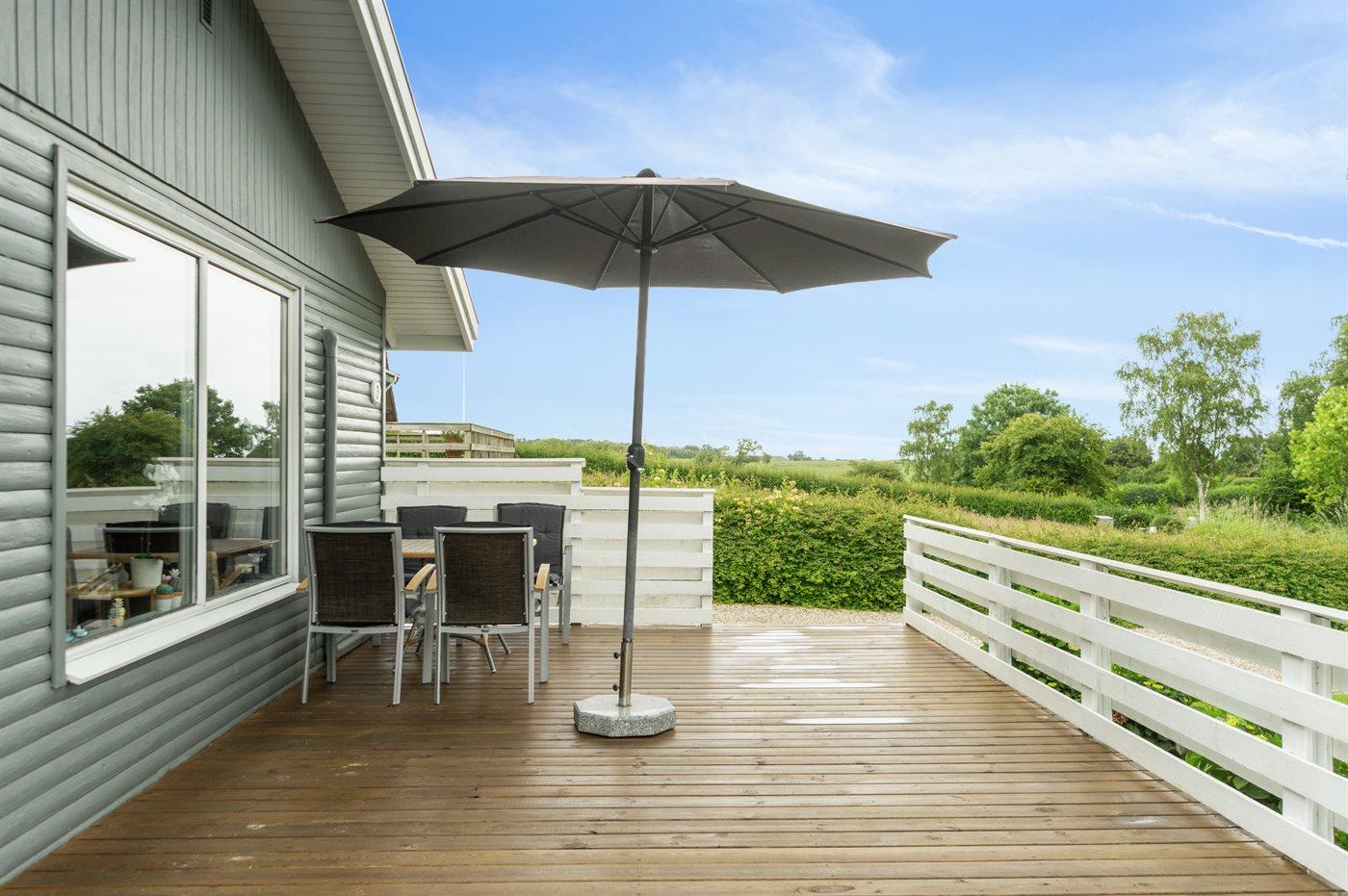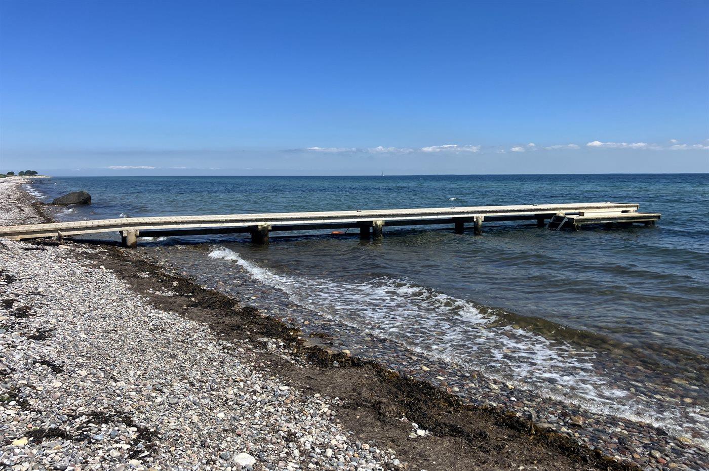 Fra både huset og det flotte, store sydvendte terrasseområde er der udsigt ud over området. Der er kun 300 m til stranden, og tæt på huset ligger både Langelands Golfklub og Langelands Lystfiskersø. Ved vandet er der i sommerperioden opsat badebro, og der er året rundt mulighed for at benytte den flydende bådebro (imod betaling på stedet), hvis man har båd med.