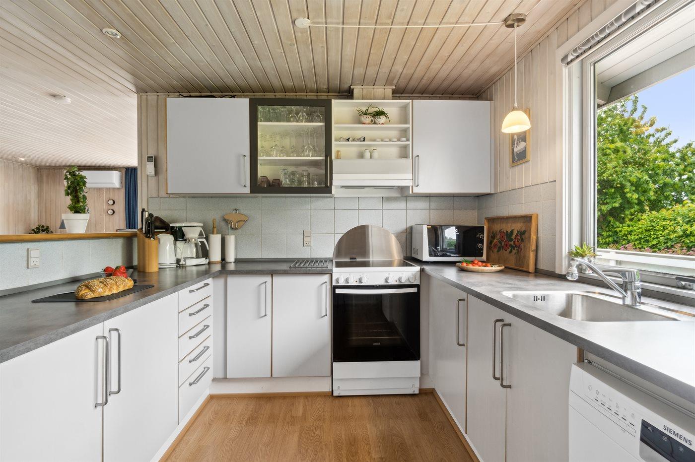 Køkkenet er udstyret med 1 køleskab. Der er 4 keramiske kogeplader, varmluftovn, mikrobølgeovn samt opvaskemaskine.