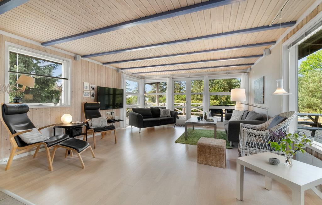 Velholdt feriehus med stor opholdsstue, 2 terrasser og delvis havudsigt tæt på sandstrand og fiskerleje.