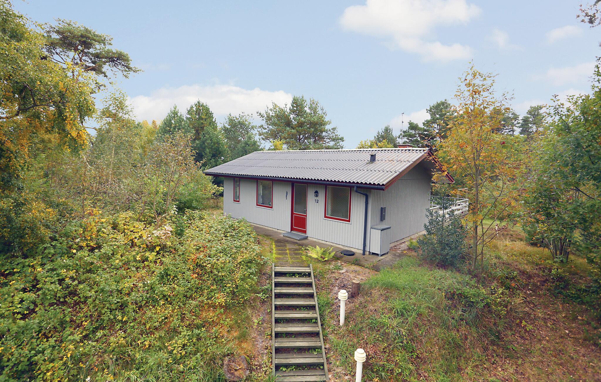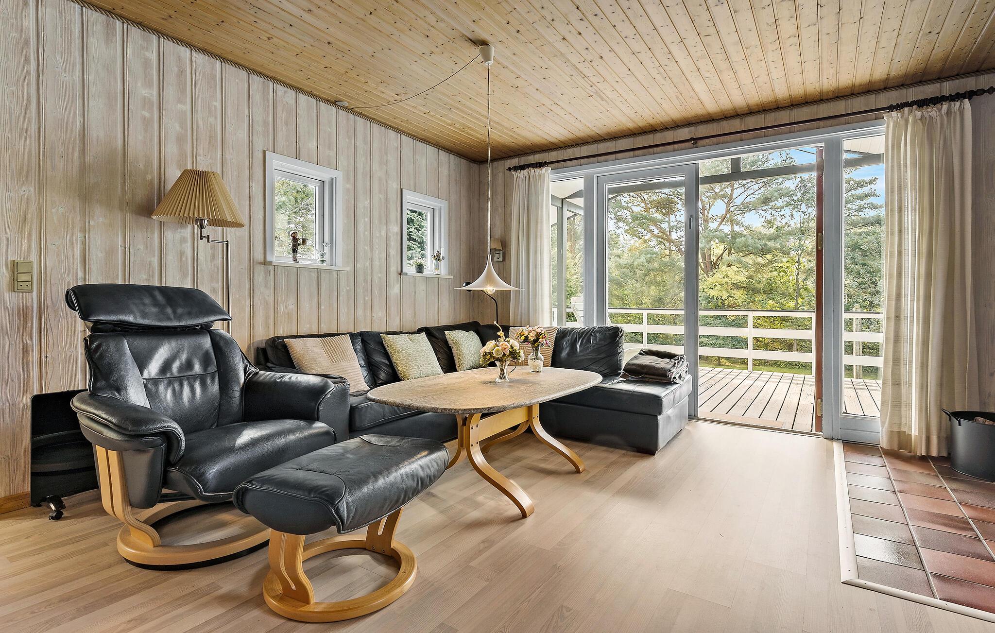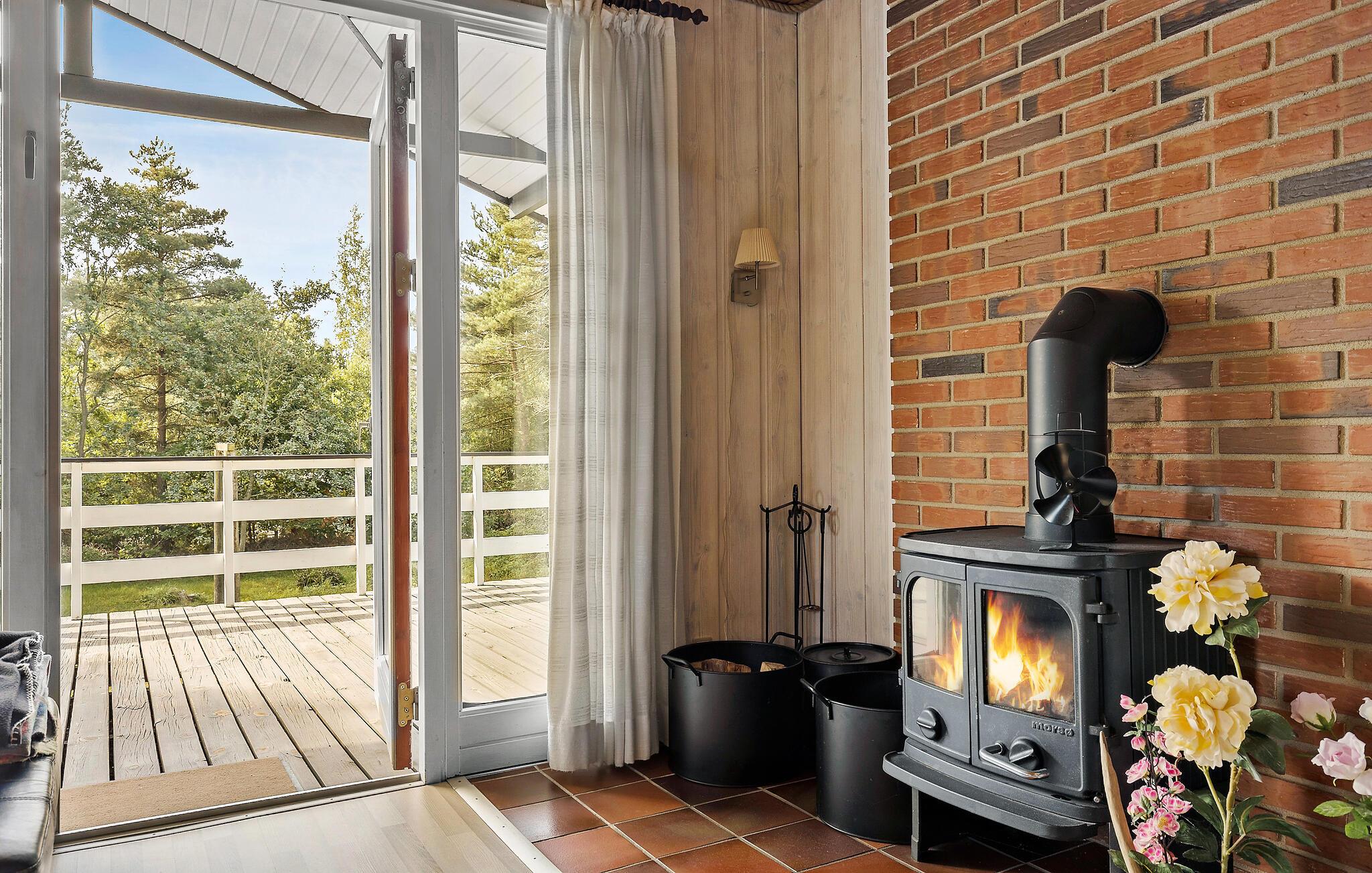 Hyggeligt træsommerhus nær strand med stor terrasse og brændeovn i roligt område på Bornholm.