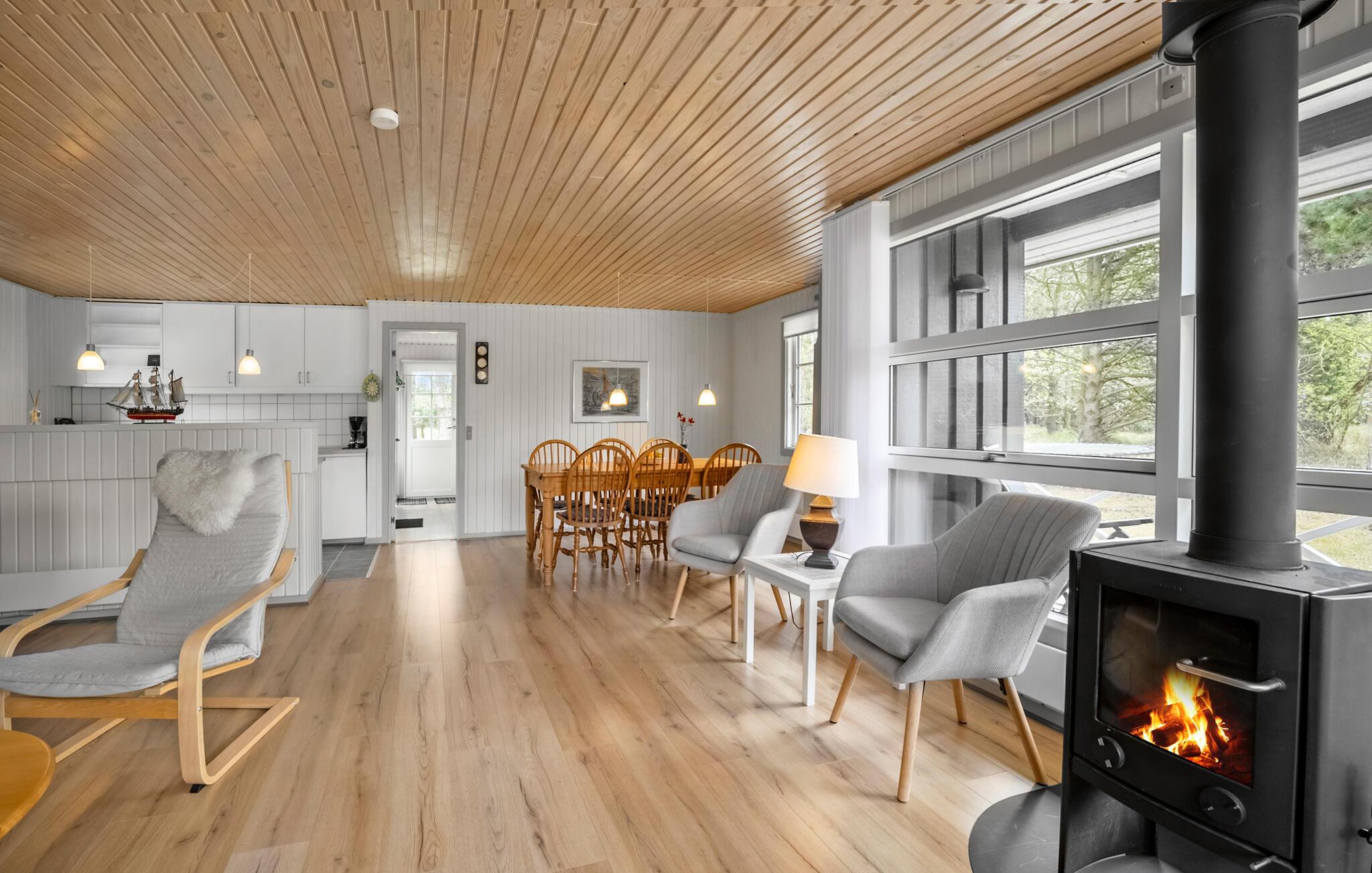 Velkommen til dette indbydende sommerhus, hvor smagfuld indretning i kombination med trægulve, vægge- og lofter indgyder en rendyrket feriestemning. Husets hjerte er den hyggelige opholdsstue med brændeovn, TV/DVD og radio/CD, som ligger i åben forbindelse til køkkenet, således at feriekokken/kokkene kan holdes med selskab.