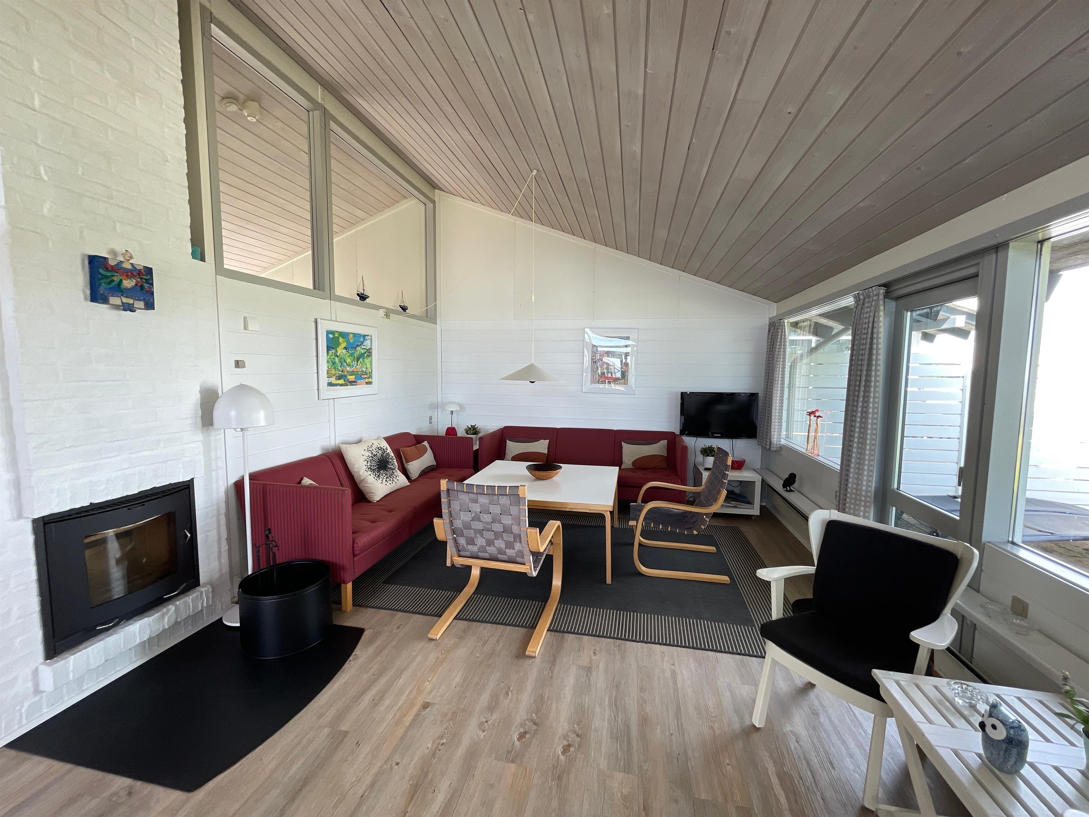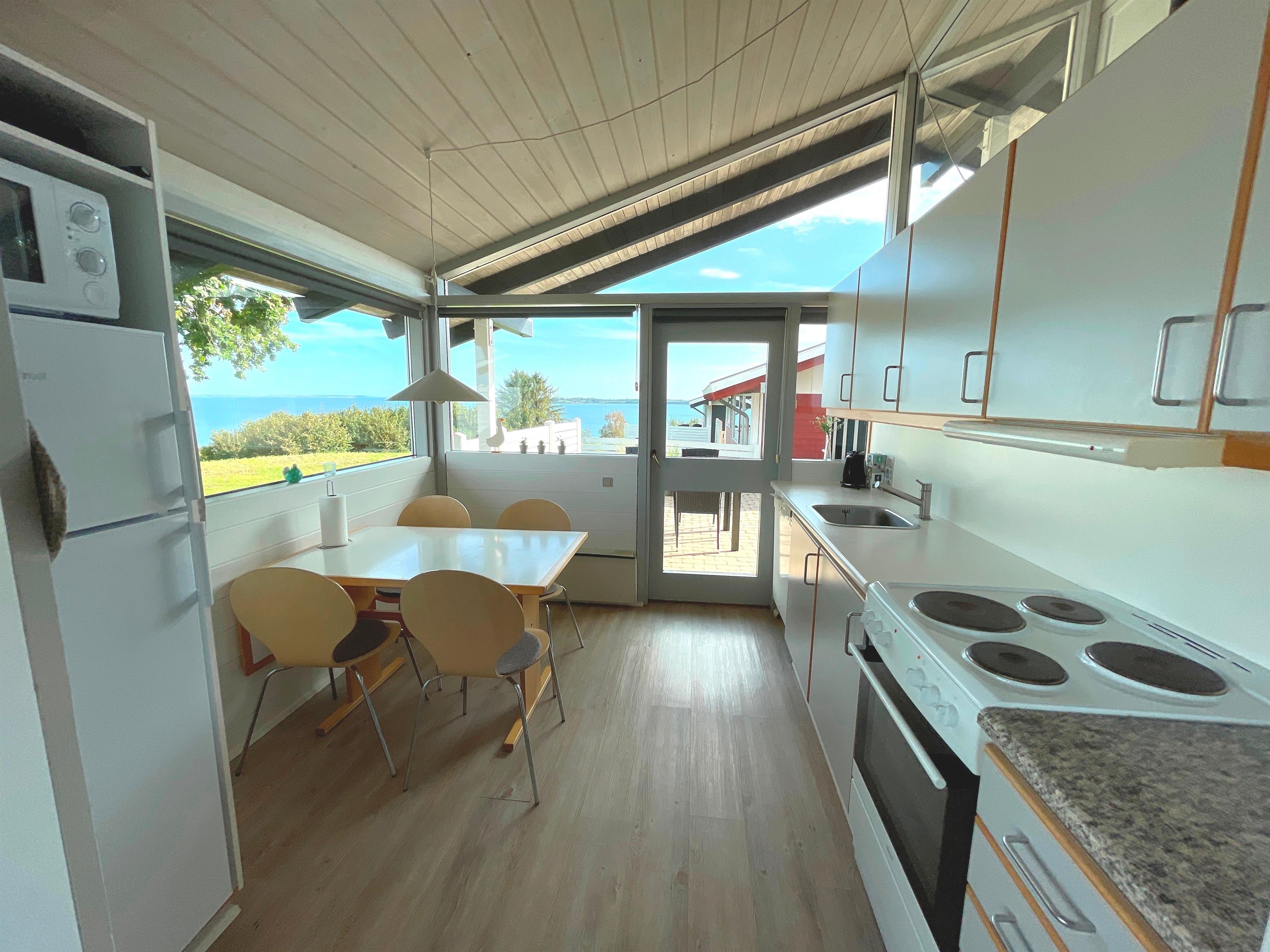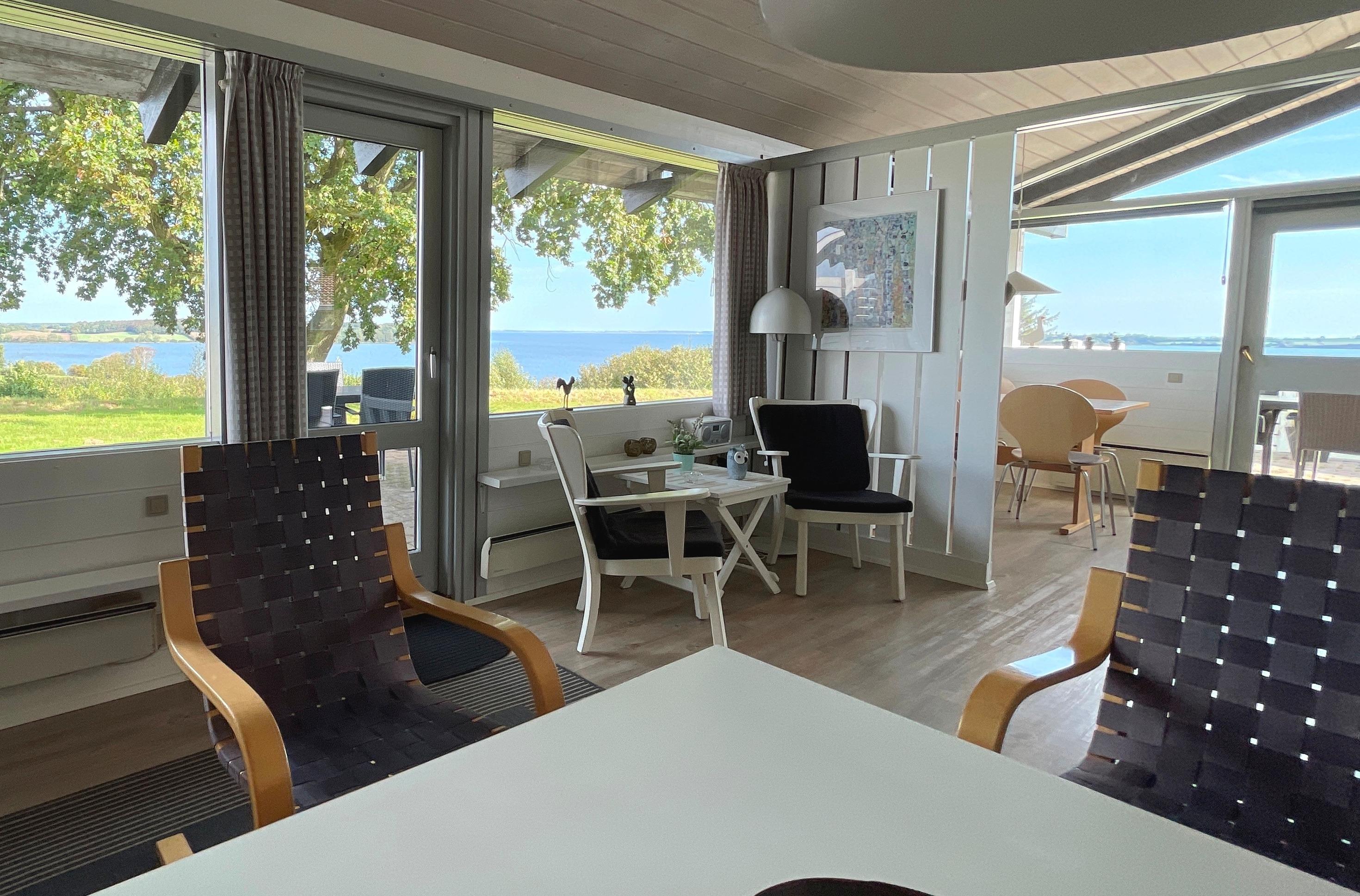 Offener Zugang von der praktischen und funktionalen Küche zum Wohnzimmer. Die großen Fenster diesen beiden Räumen sorgen neben den fantastischen Meerblick (über Kleine Belt) auch für viel natürliches Licht im Inneren.