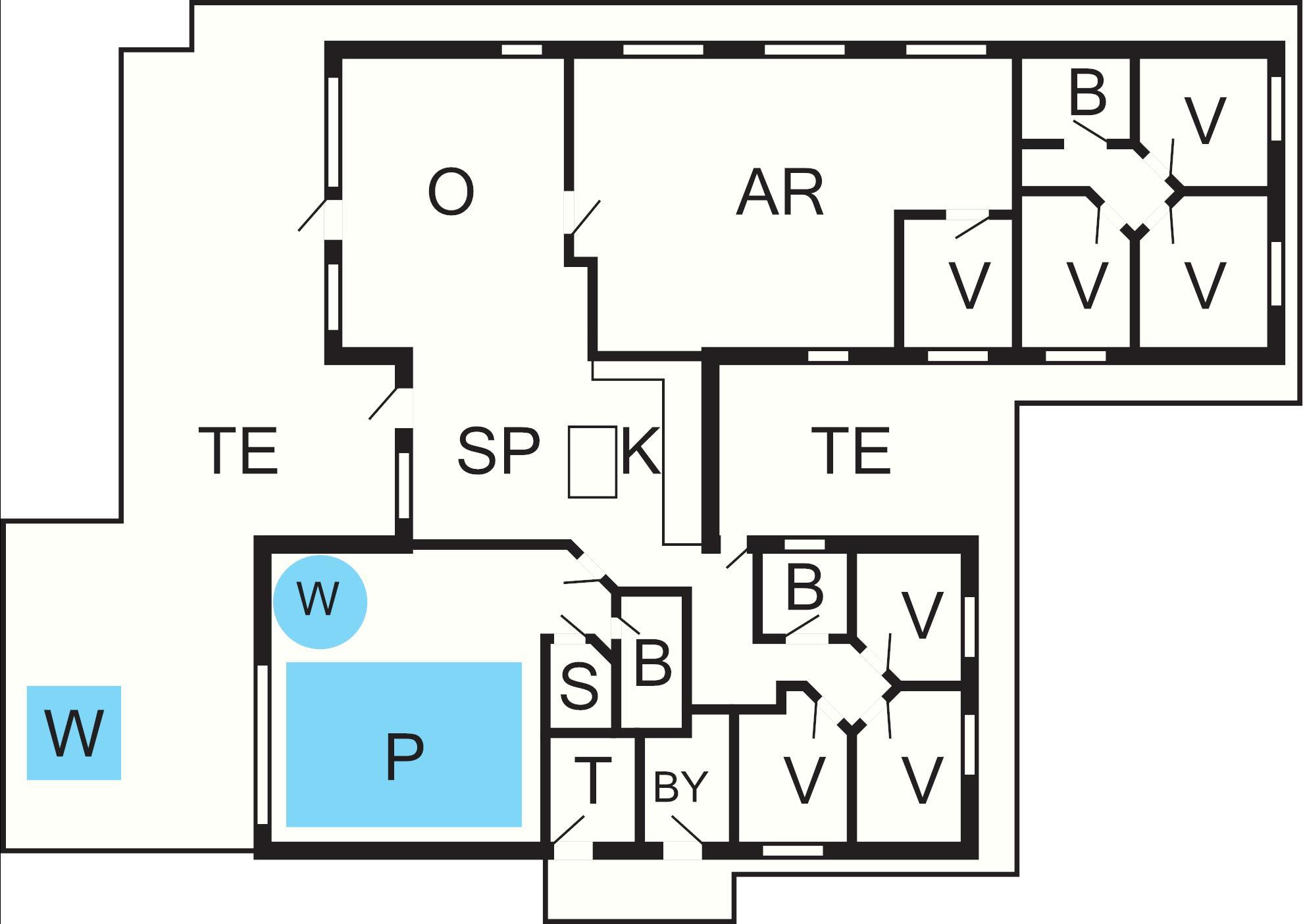 7 Soveværelser: (1DS)+(1DS)+(2S)+(2S)+(2S)+(2S)+(2S)