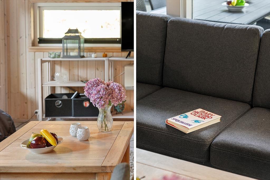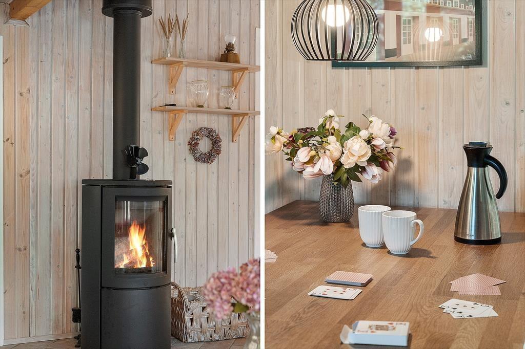 Indenfor mødes du af en lys og hyggelig atmosfære, der straks inviterer til afslapning. Det åbne køkken ligger i forbindelse med stuen, så madlavningen bliver en social oplevelse, hvor du kan snakke med resten af familien, mens du forbereder feriens lækkerier. I stuen er der god plads til både måltider ved spisebordet og afslappende stunder i sofaen – og når aftenen falder på, kan I tænde op i brændeovnen og mærke den rolige varme brede sig. Indretningen er enkel og hyggelig, så du nemt kan føle dig hjemme fra første øjeblik. Her er plads til både samvær og stille stunder, hvor du kan synke ned med en god bog eller bare nyde udsigten til de grønne omgivelser.