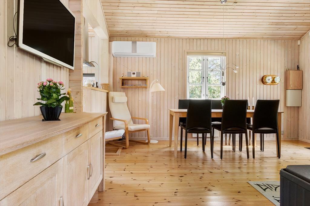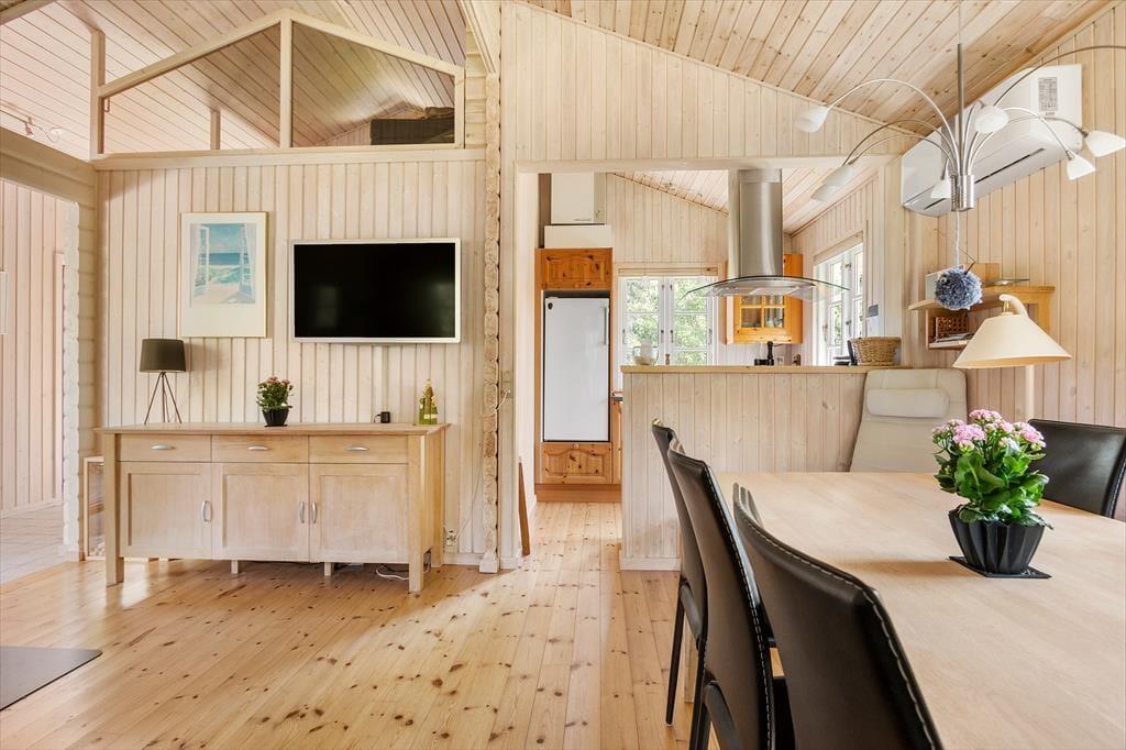 Huset ligger midt i naturen, og allerede ved ankomsten mærker man roen og freden indfinde sig. Her får du klassisk sommerhushygge ude såvel som inde, og i den dejlige stue kan du sidde og nyde udsigten til alt det grønne udenfor. Opholdsrummet har loft til kip og lyst træ på væggene, som sammen med de fine sprossevinduer bidrager til den lyse og behagelige atmosfære. Der er direkte udgang til terrassen fra stuen, som også er udstyret med en hyggelig brændeovn. Køkkenet er på klassisk sommerhusmanér åbnet mod stuen, så du kan kokkerere og stadig være med i samtalen rundt om bordet. Huset indeholder herudover to soveværelser og et badeværelse.