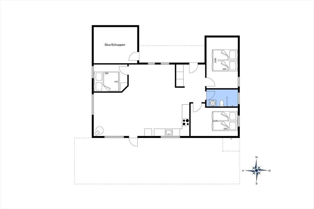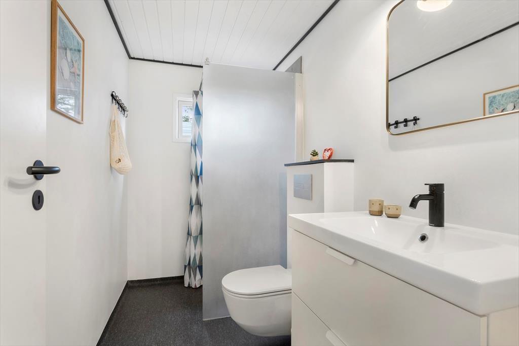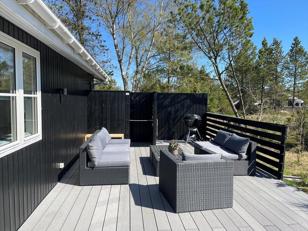 Sommerhusets badeværelse er lyst og pænt som de øvrige rum, men når vejret er til det, har du også mulighed for at tage dit morgenbad i det fri under udebruseren – sikke en skøn start på dagen, du kan få her! Solskinstimerne kan oplagt nydes på den store og sydvendte træterrasse, der er godt afskærmet ud mod vejen og derudover har udsigt til den dejlige naturgrund. Når aftenen nærmer sig, kan du og dine kære slappe af i loungemøblerne, mens grillen bliver klar, og mon ikke, at aftensmaden smager endnu skønnere, når den bliver nydt i så rolige og idylliske omgivelser.