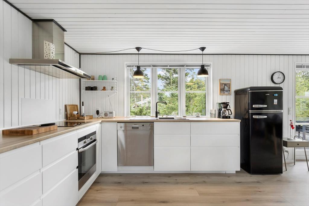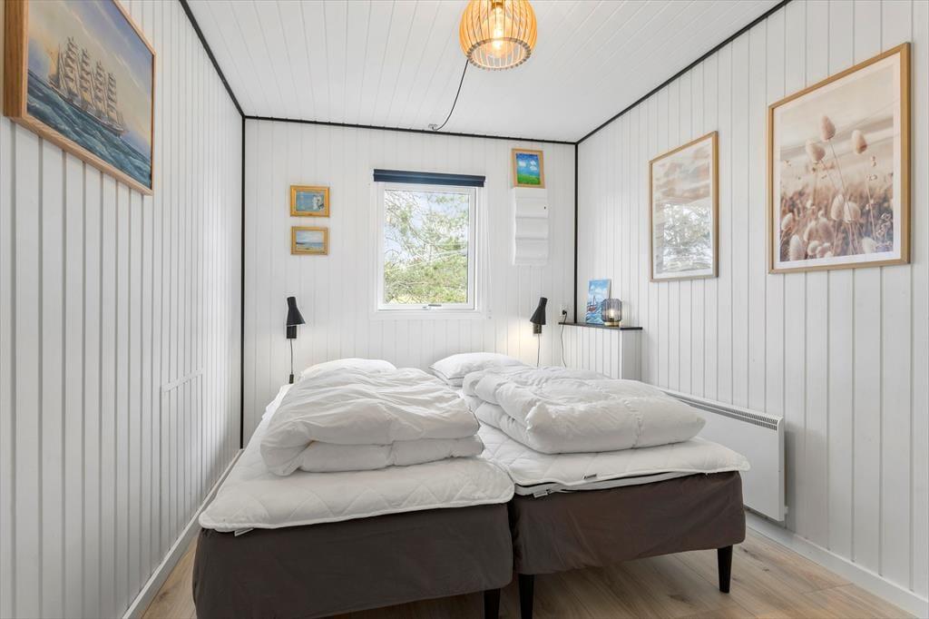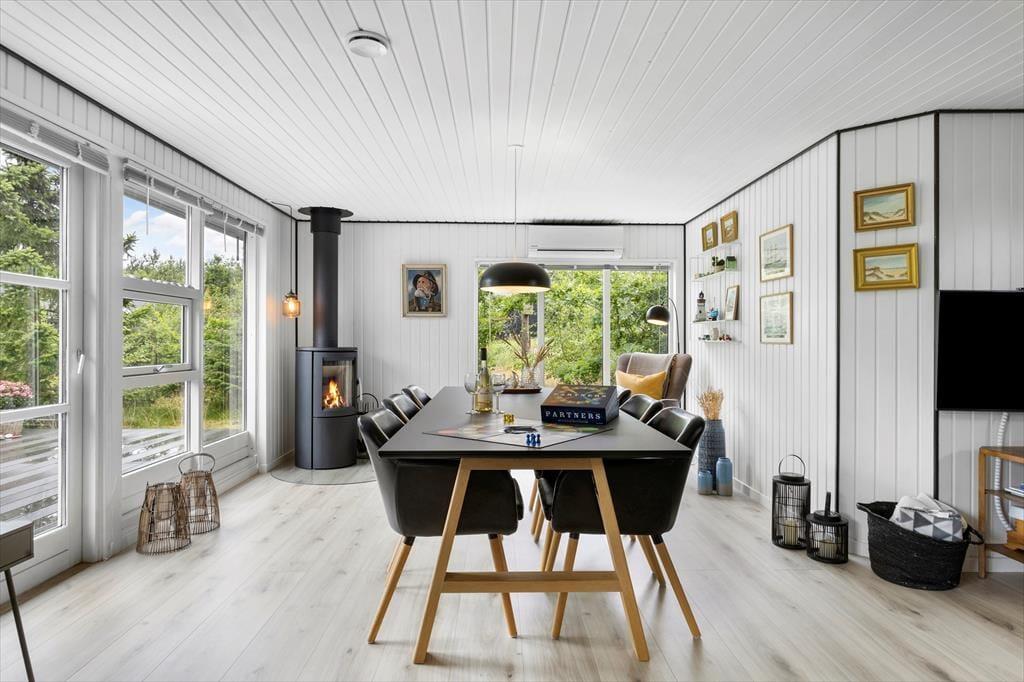 Atmosfæren er lys og let inden døre i sommerhuset, der blev renoveret på vellykket vis i 2021. De tre soveværelser er alle rare at sove i, og på det ene hænger der endda en fladskærm på væggen, hvis du vil slutte dagen af med at se tv. I stuen er der også mulighed for at samles til filmaftener i sofaafdelingen, hvis ikke det er kortspil, krydsogtværser og hyggesnak, du og dine kære bruger tiden på. Stuen er både udstyret med brændeovn og dør ud til terrassen, så her er godt at være på alle årstider, og i det åbne køkken har du alle de nødvendige faciliteter, når der skal laves mad.