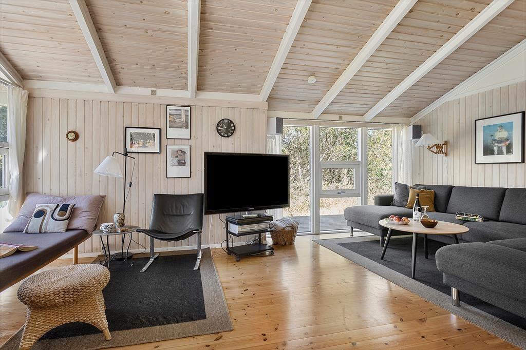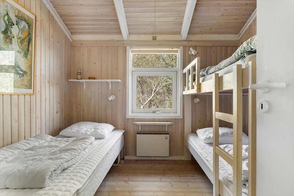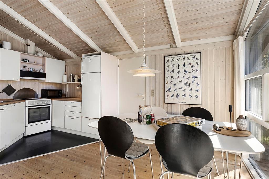 Indendørs er stemningen præget af luft, lys og ægte feriehygge. Huset er indrettet i en afslappet og indbydende stil, hvor loft til kip og et stort vinduesparti giver masser af naturligt lys og udsyn til de grønne omgivelser. Det store opholdsrum samler ferieoplevelserne i ét: Her er sofaområde til spil og afslapning, spiseplads til måltider og snak – og ikke mindst en stemningsskabende brændeovn, der varmer, når det rusker udenfor. I forlængelse af opholdsrummet ligger det indendørs poolområde, hvor du kan starte dagen med en frisk svømmetur eller hygge dig med familien i vandet – og bagefter hoppe en tur i saunaen for total afslapning. Hele huset emmer af velvære og giver dig det perfekte udgangspunkt for en ferie med både aktivitet og ro.