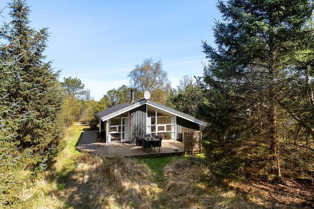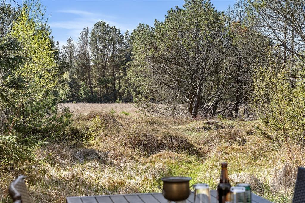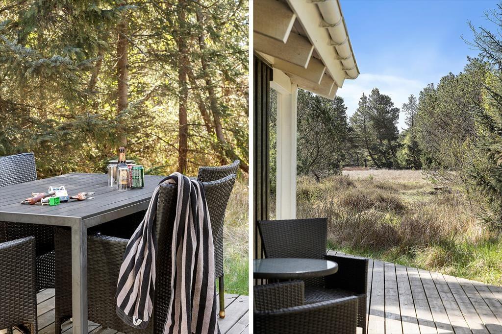 Udenfor venter sommerhuslivet i sin mest fredelige form. Huset ligger på en ugeneret naturgrund med høje træer og grøn bevoksning, der giver privatliv og en følelse af at være midt i naturen. På terrassen kan du nyde morgenkaffen til fuglefløjt og solstrejf, læse en god bog i liggestolen eller gøre klar til grillhygge og lange aftener under åben himmel. Flere terrasseområder giver mulighed for at finde både sol og skygge, alt efter humør og tidspunkt på dagen – og uanset om du er til rolig afslapning eller leg med børnene i det fri, får du rammerne til det her. Det er den slags omgivelser, hvor skuldrene automatisk sænker sig, og hverdagens travlhed bliver erstattet af nærvær og natur.