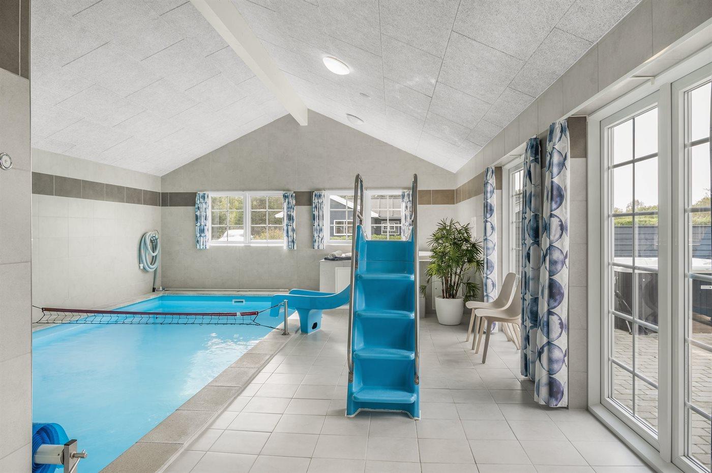Her er der ikke sparet på noget! Sommerhuset er bl.a. udstyret med en indendørs saltvandspool, som grundet det lave kemikalieindhold er særlig hudvenlig. Swimmingpoolen er desuden udstyret med vandrutsjebane, romertrappe og undervandslys.