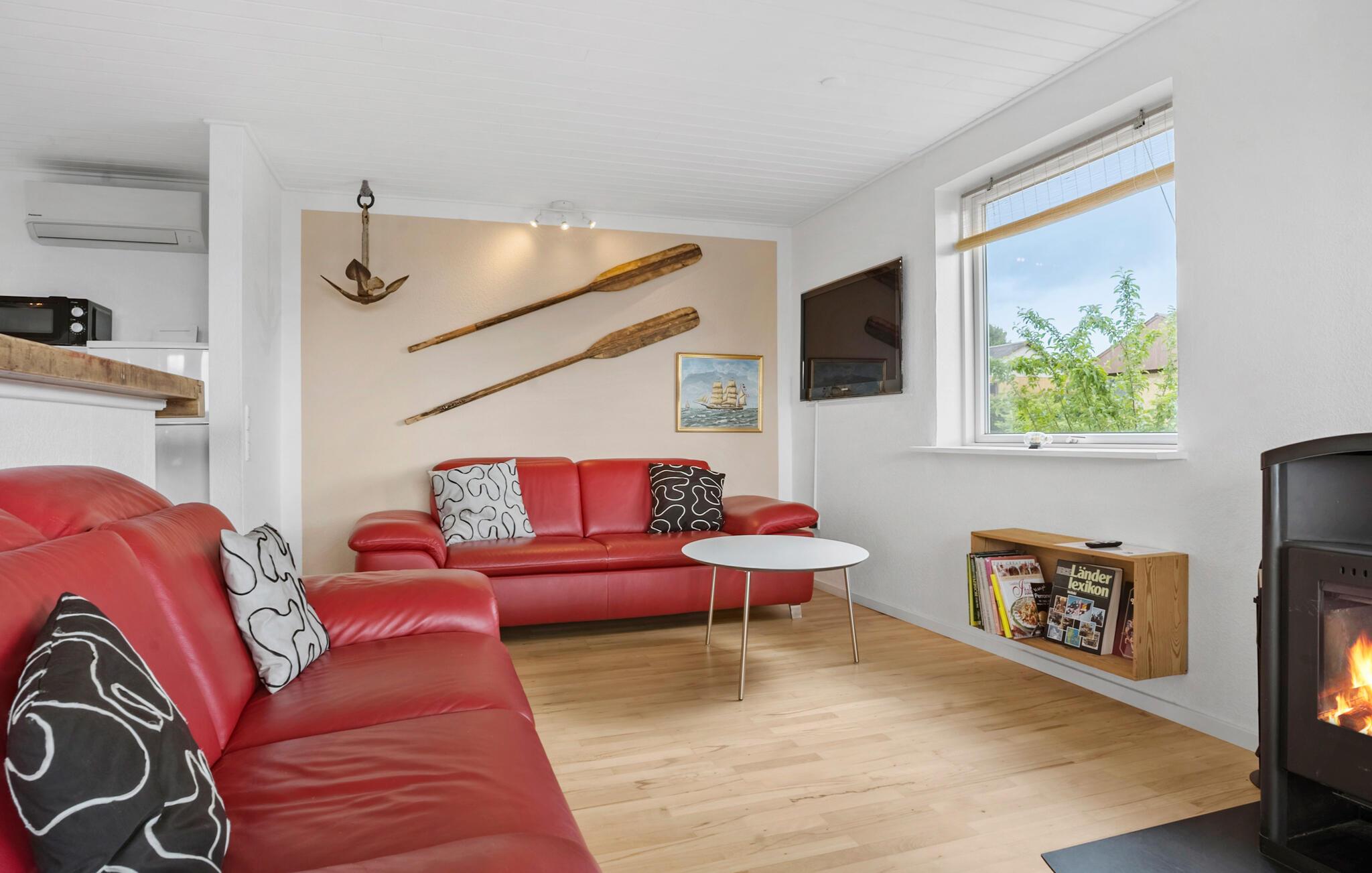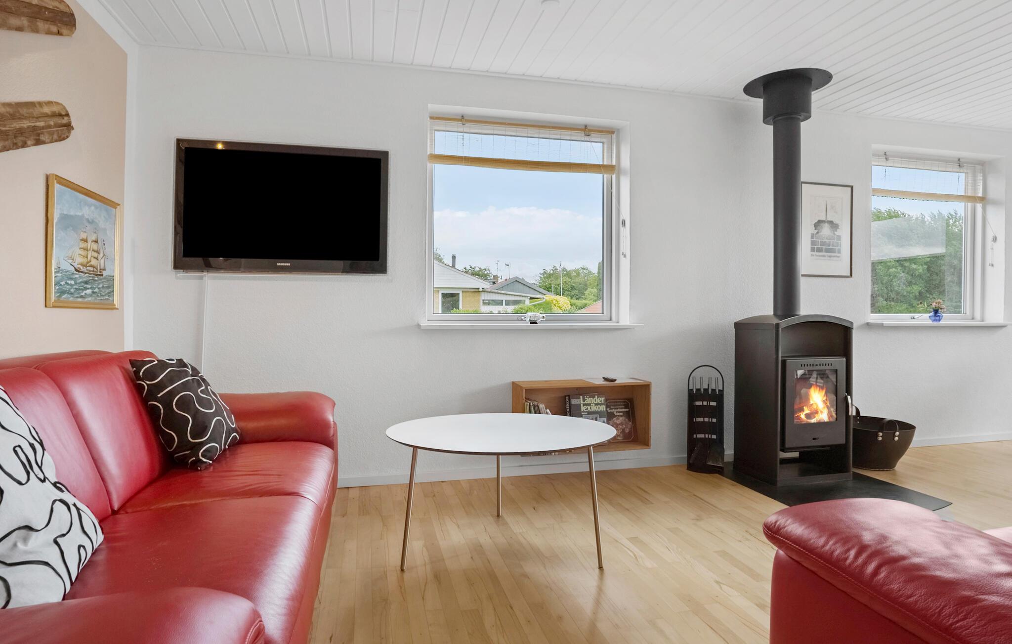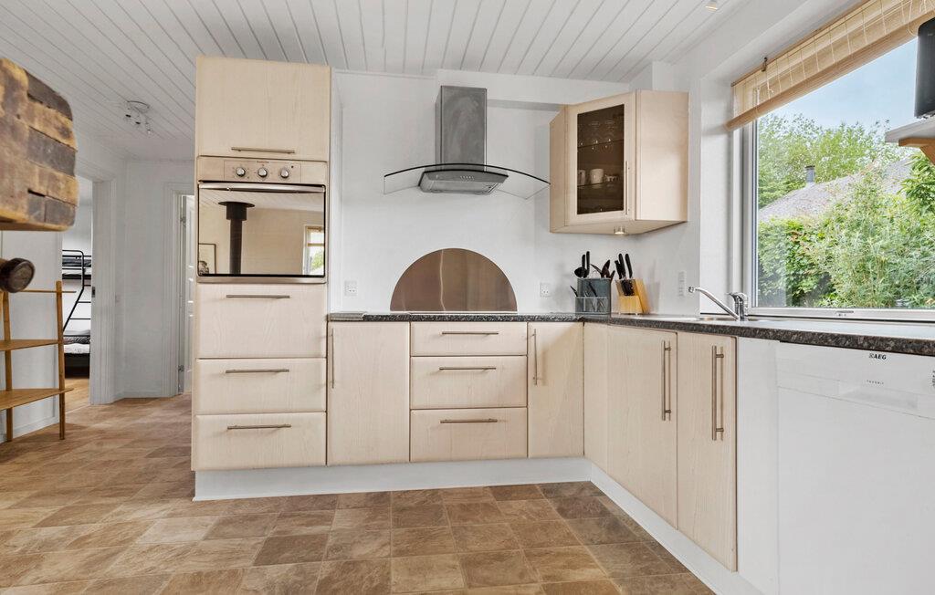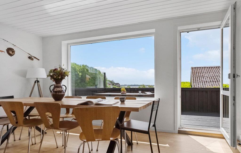 Omgivet af smuk natur og med en vidunderlig udsigt over vandet, er dette charmerende feriehus på Adsbøl Strand det ideelle sted at komme væk fra det hele. Lad jer fortrylle af de rolige omgivelser og nyd afslappende dage ved havet. Den åbne stue med store vinduespartier giver masser af lys og en imødekommende atmosfære. Find jer godt til rette i sofaen, hvor brændeovnen giver hyggelig varme på køligere dage. I kan lave mad sammen i det veludstyrede køkken med køkkenbord og nyde jeres måltider ved det store spisebord i træ. Det åbne design skaber en harmonisk sammenhæng mellem madlavning, spisning og afslapning.
