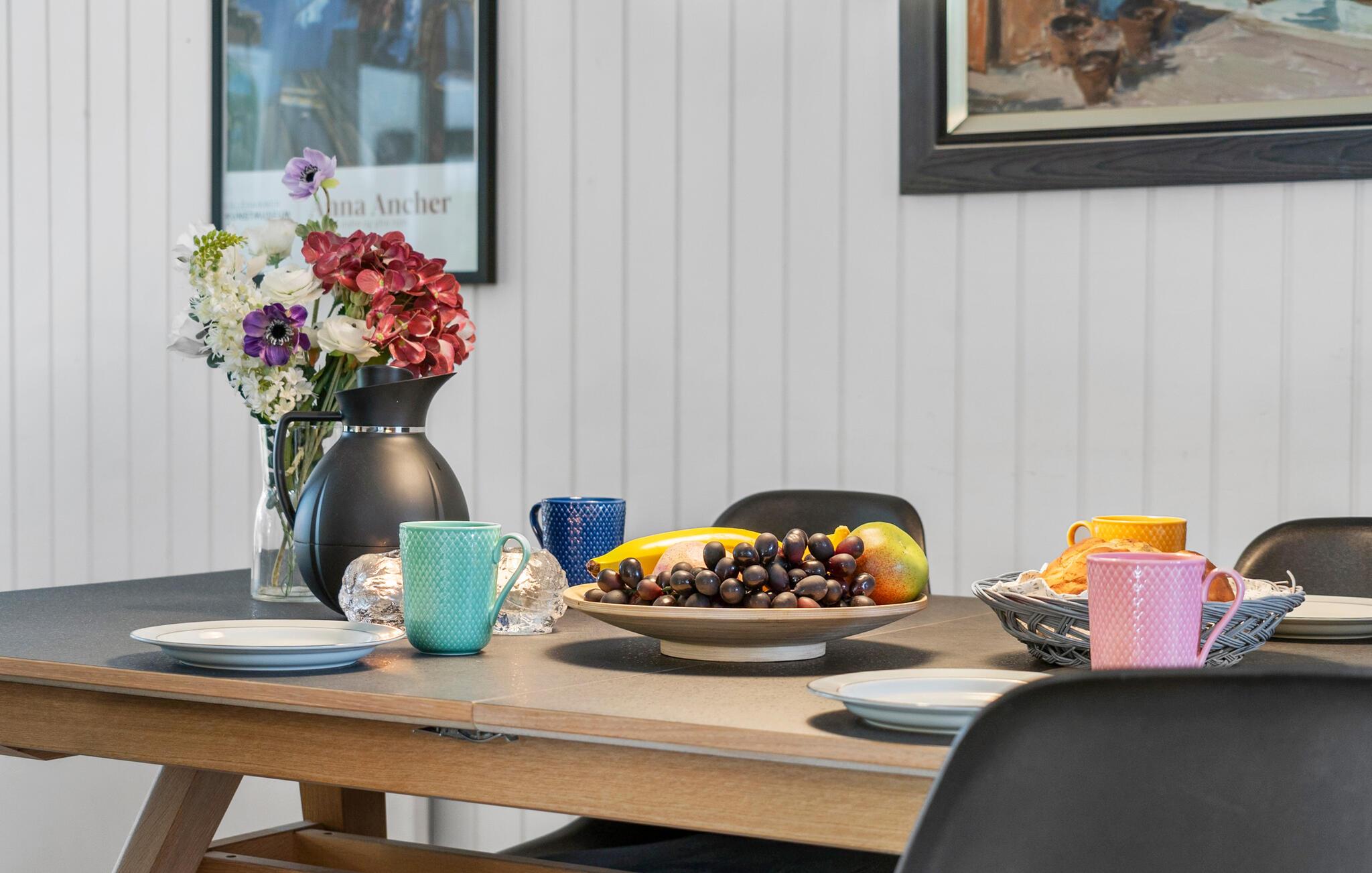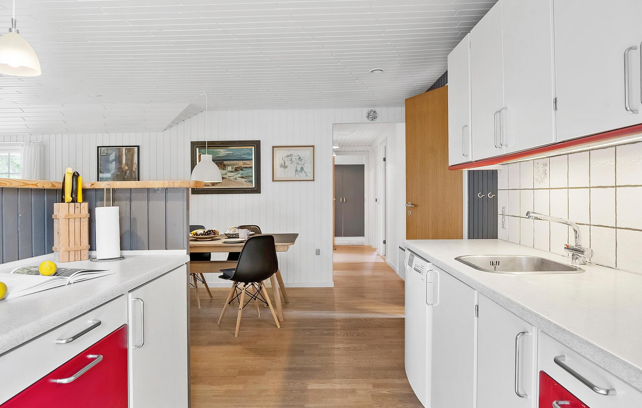 Dette lyse hus lægger op til en afslappende pause fra hverdagen. Den komfortable sofagruppe lægger op til at slappe af med en kop kaffe, og I kan tilberede lækre måltider i det moderne køkken. På køligere dage kan I tænde brændeovnen eller nyde den hyggelige varme i saunaen.