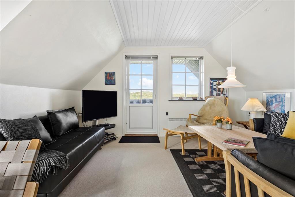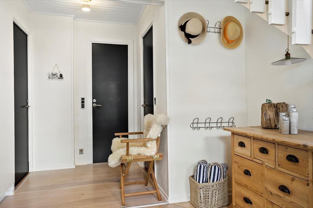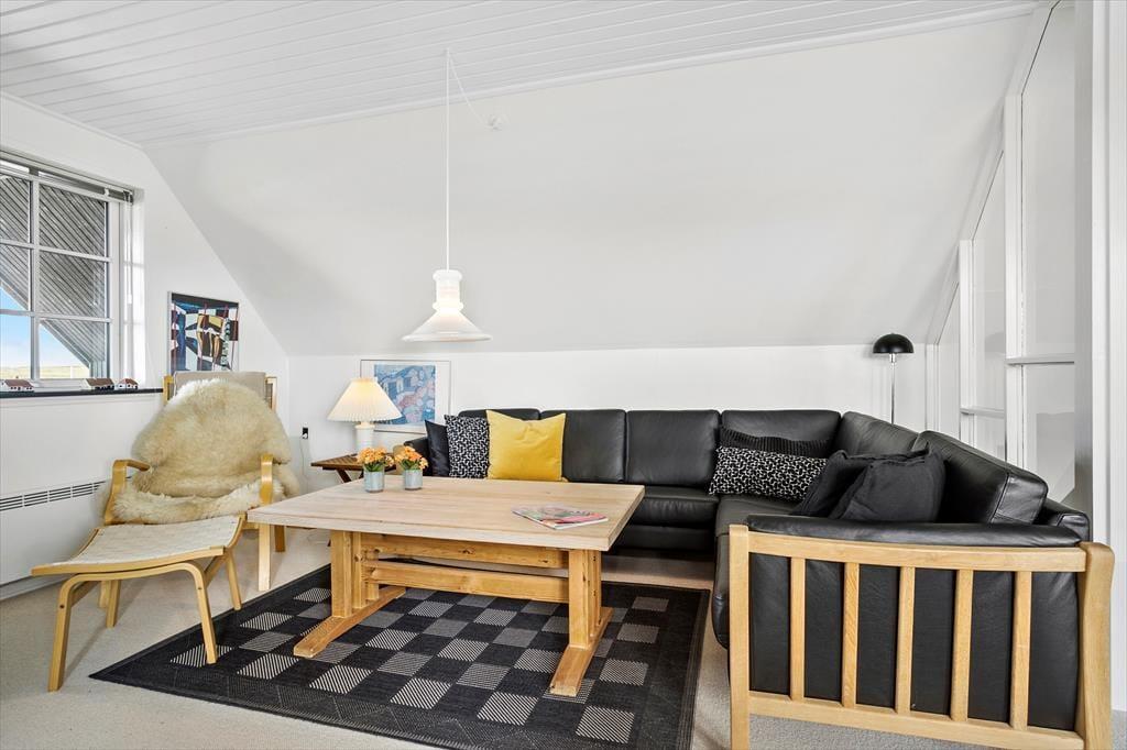 Når du træder indenfor, mødes du af en varm og indbydende atmosfære, hvor det åbne opholdsrum med kvalitetsmøbler straks gør indtryk. Sommerhuset er fordelt på to plan, hvilket giver plads til både samvær og privatliv, uanset om du er på ferie med familie eller venner. Den dejlige udestue er som skabt til at forlænge aftenerne.