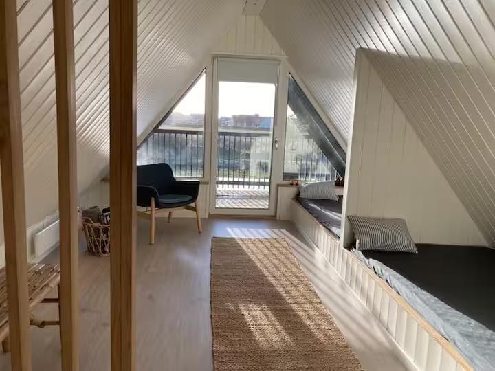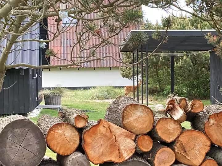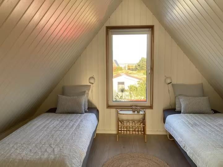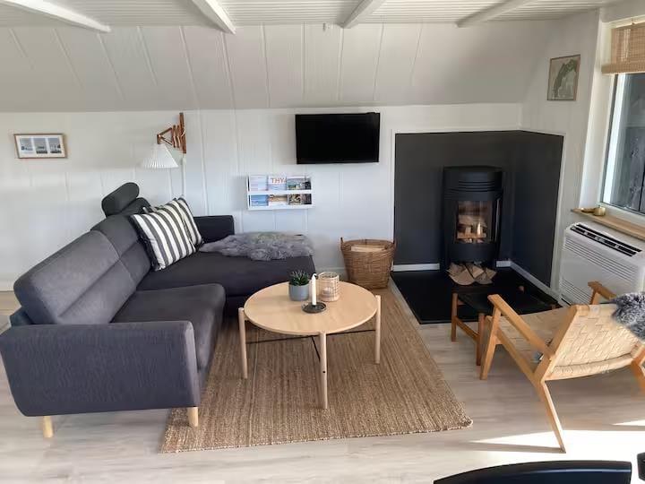 Allerede når du træder ind i huset, mærker du, hvordan æstetik og komfort går hånd i hånd. Det karakteristiske A-formede design skaber højt til loftet og en luftig rumfornemmelse, mens de lyse materialer og den smagfulde indretning giver en rolig og indbydende stemning. Her er kræset for detaljerne, og du vil hurtigt opdage, hvordan de små finesser – fra de smukt afstemte farver til den hyggelige belysning – er med til at gøre ferien lidt ekstra særlig. Om aftenen samles I måske i sofaen med et spil eller en god film, mens ilden fra brændeovnen knitrer og varmer stuen op – eller du nyder bare stilheden og en kop te med udsigt til klitternes bølgende landskab.
