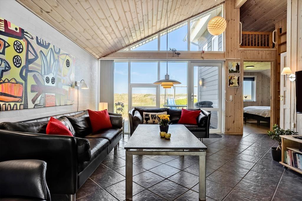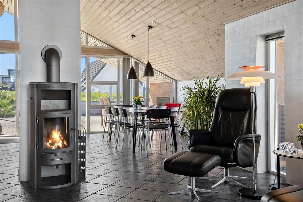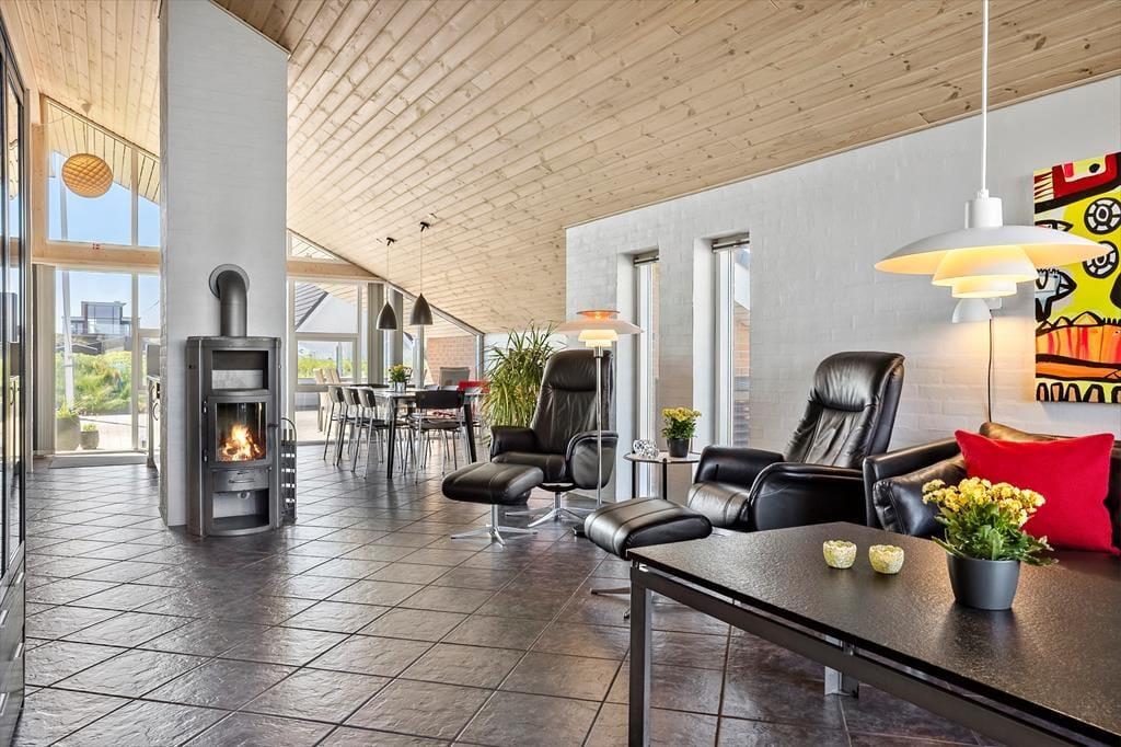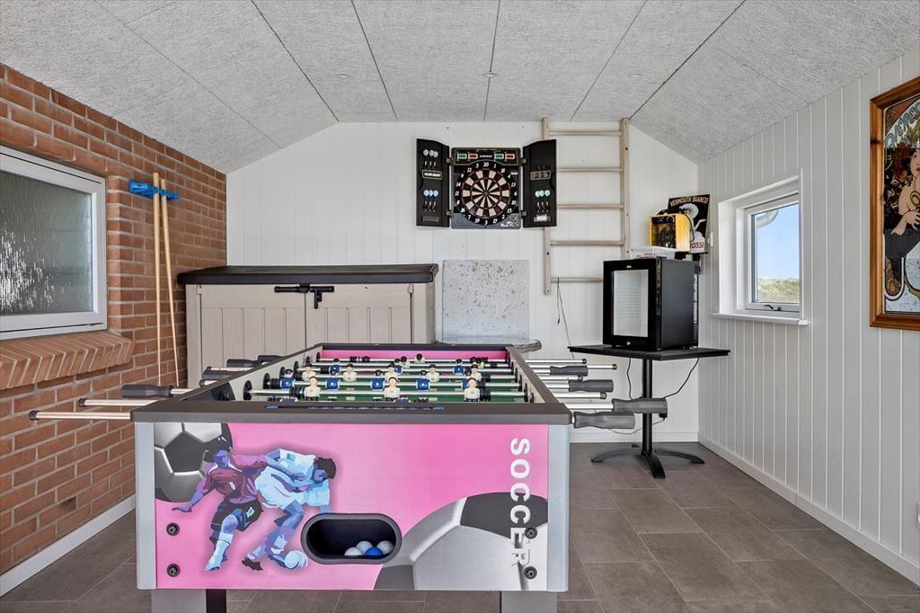 Dette indbydende sommerhus byder dig velkommen med en varm og afslappet stemning, hvor kvalitet og hygge går hånd i hånd. I den lyse stue, der ligger i åben forbindelse med køkkenet, breder udsigten over klitlandskabet sig lige uden for vinduerne – et fredfyldt bagtæppe for samvær og nærvær. Brændeovnen knitrer i hjørnet og skaber en behagelig varme, mens varmepumpen sørger for et lavt energiforbrug og et godt indeklima året rundt. I aktivitetsrummet kan store som små dyste i dart og bordfodbold – perfekt til hyggelige timer på dage med vestenvind. Her er plads til afslapning, grin og gode stunder, uanset om du rejser med børn, venner eller bare trænger til et afbræk fra hverdagen.
