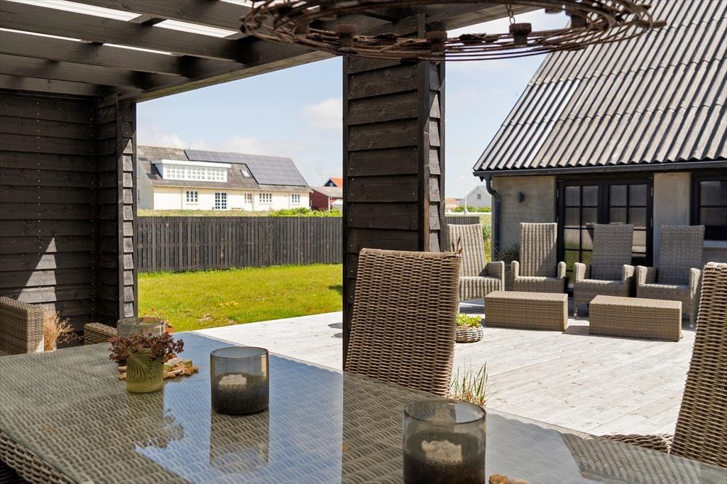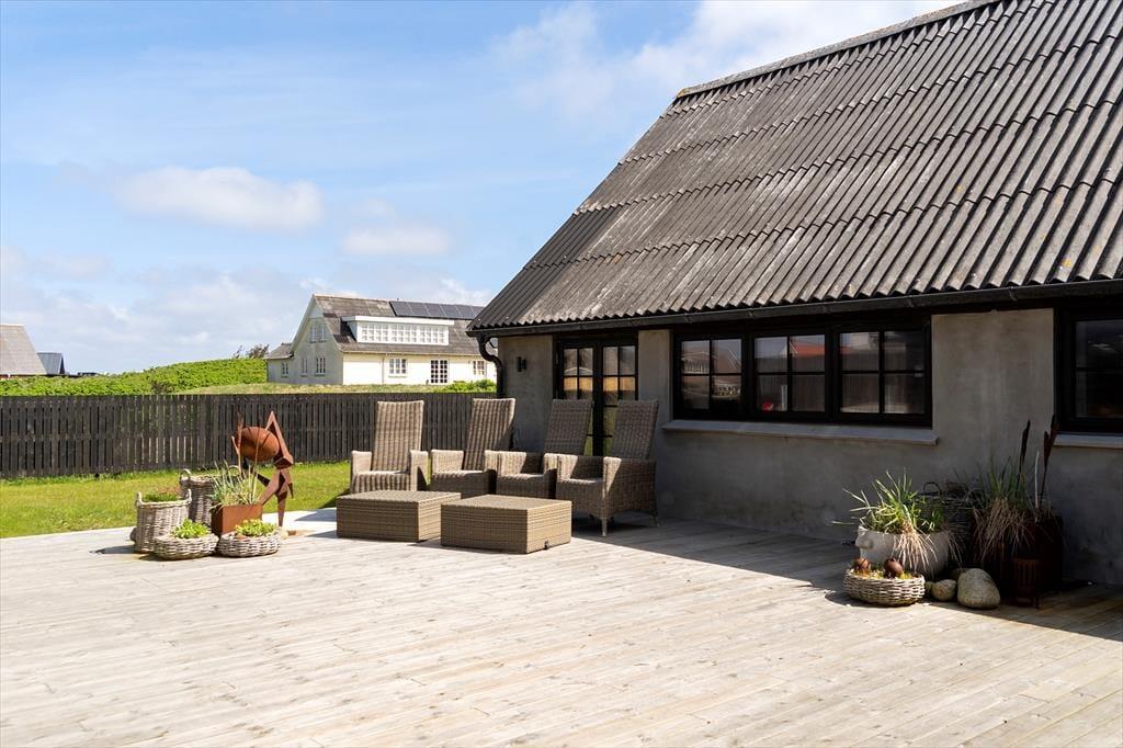 Udenfor venter en stor terrasse og et skønt udeområde, hvor du kan nyde livet i den friske vestkystluft. Her er plads til solbadning, hyggelige grillmiddage og leg på plænen for de yngste i familien. Terrassen er designet, så du altid kan finde en solstråle eller søge skygge, når det bliver nødvendigt. Den store grund giver masser af muligheder for udendørs aktiviteter, og med Vesterhavet lige i nærheden kan I nemt kombinere ferien med strandture og havets beroligende rytme.