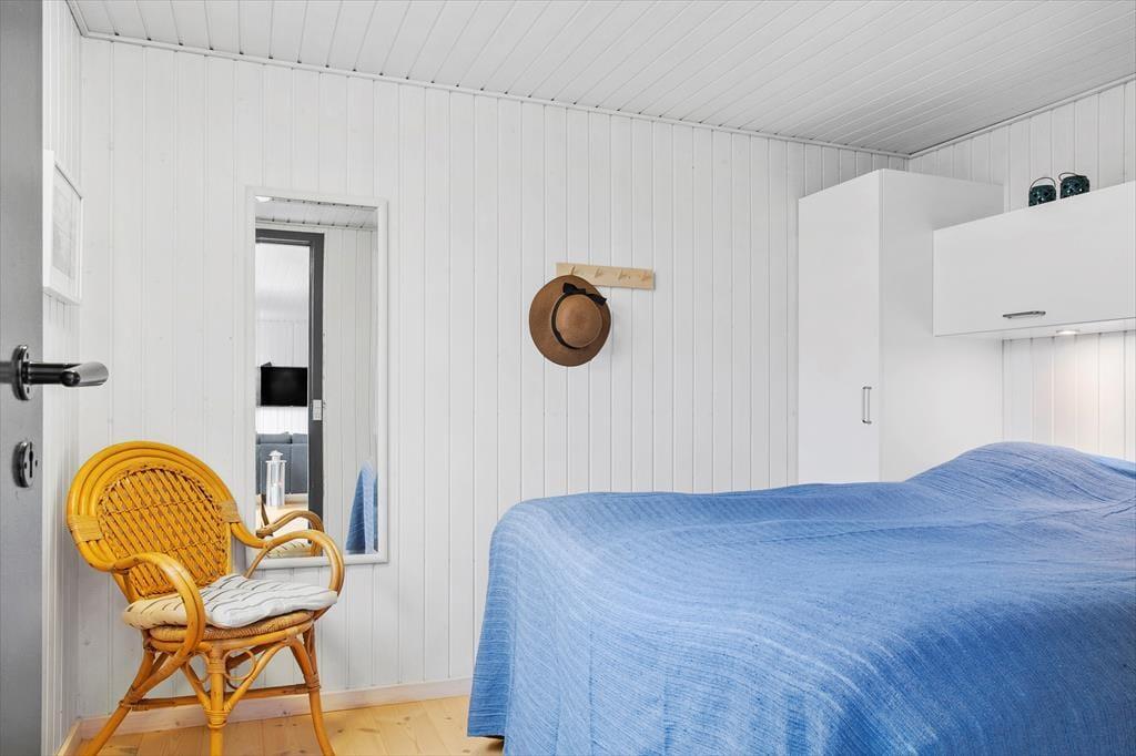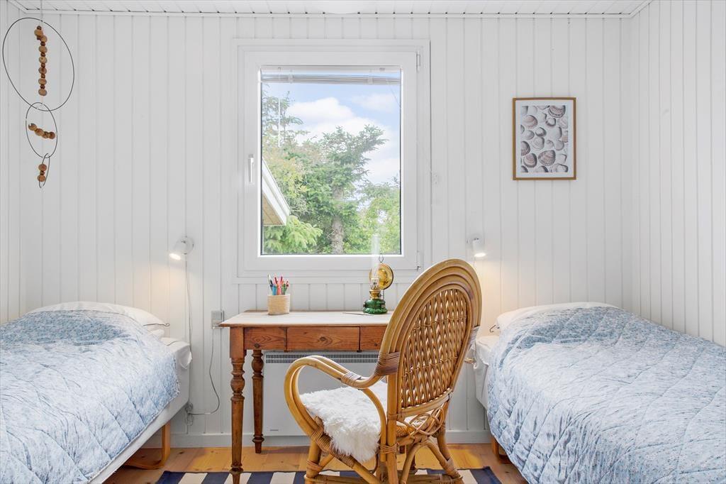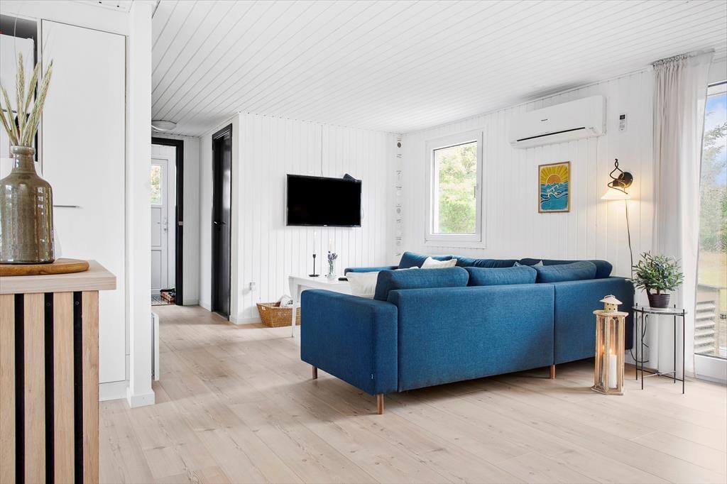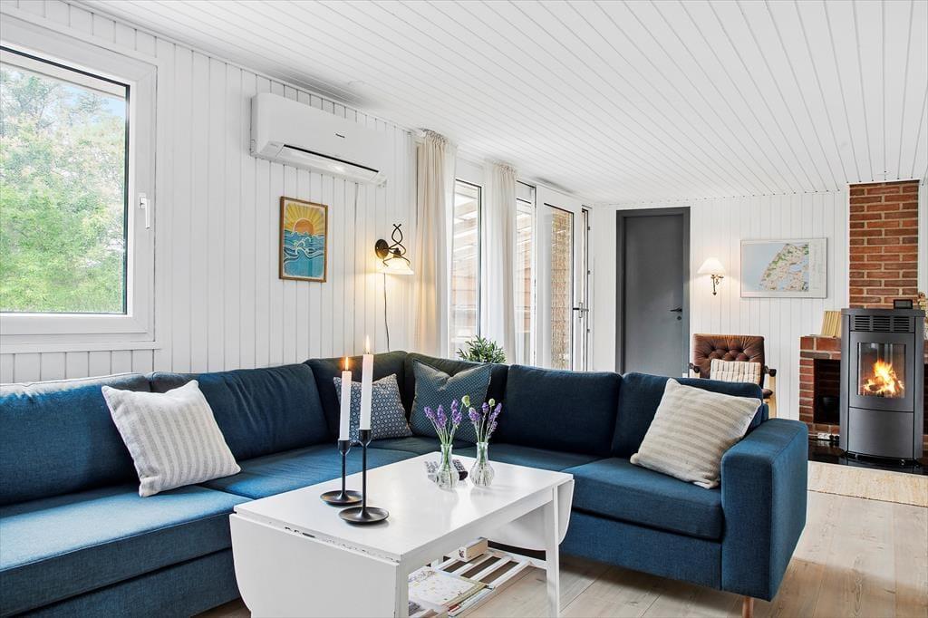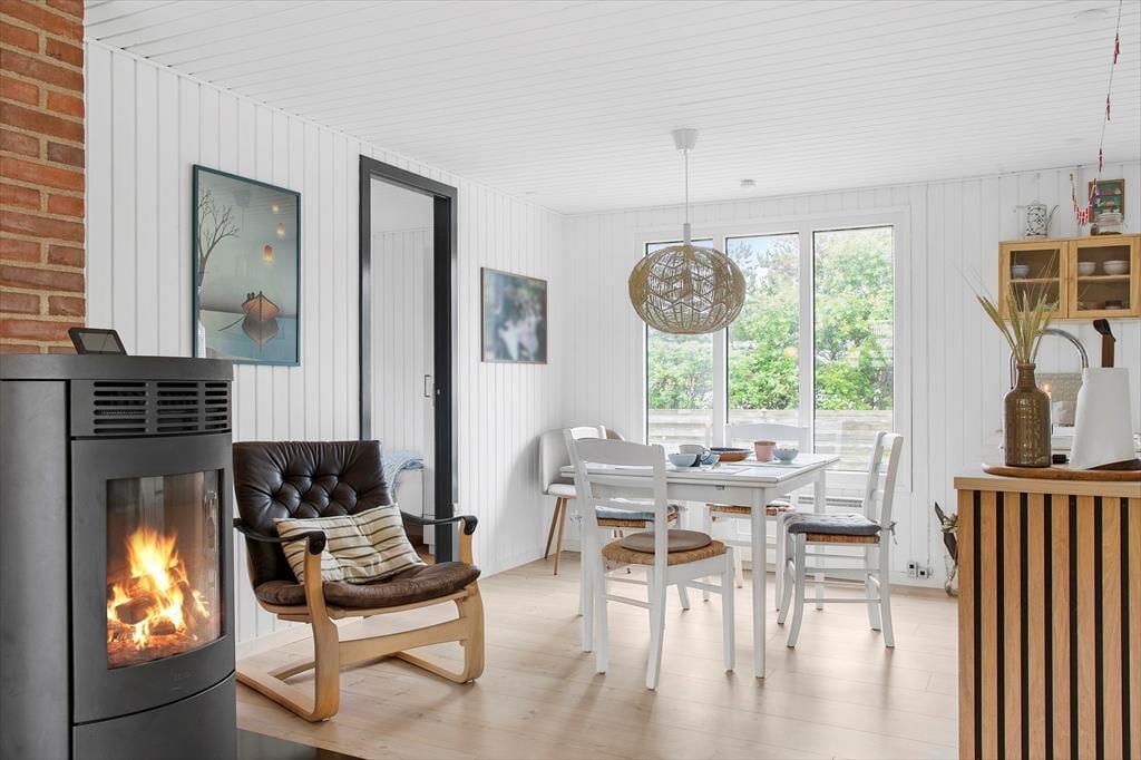 Sommerhuset er indrettet med fokus på hygge og samvær. Det lyse opholdsrum samler stue, spiseplads og køkken i ét, så I kan nyde hinandens selskab – uanset om der laves mad, spilles brætspil ved bordet eller slappes af i sofaen. Brændeovnen bliver hurtigt familiens favorit, når ilden knitrer og skaber en varm og rolig atmosfære, særligt efter en dag med udendørs oplevelser. De bløde møbler og den enkle, men hyggelige indretning, gør det nemt at falde til og slappe af, og med plads til op til 6 personer er her rig mulighed for, at både store og små kan nyde ferien sammen.