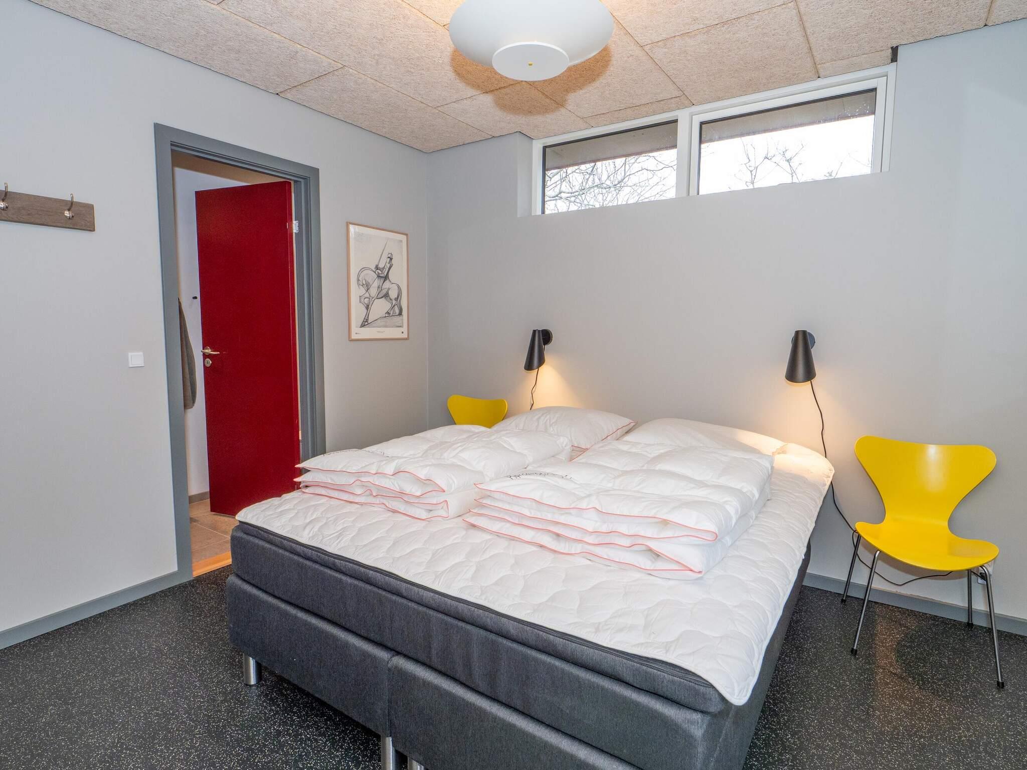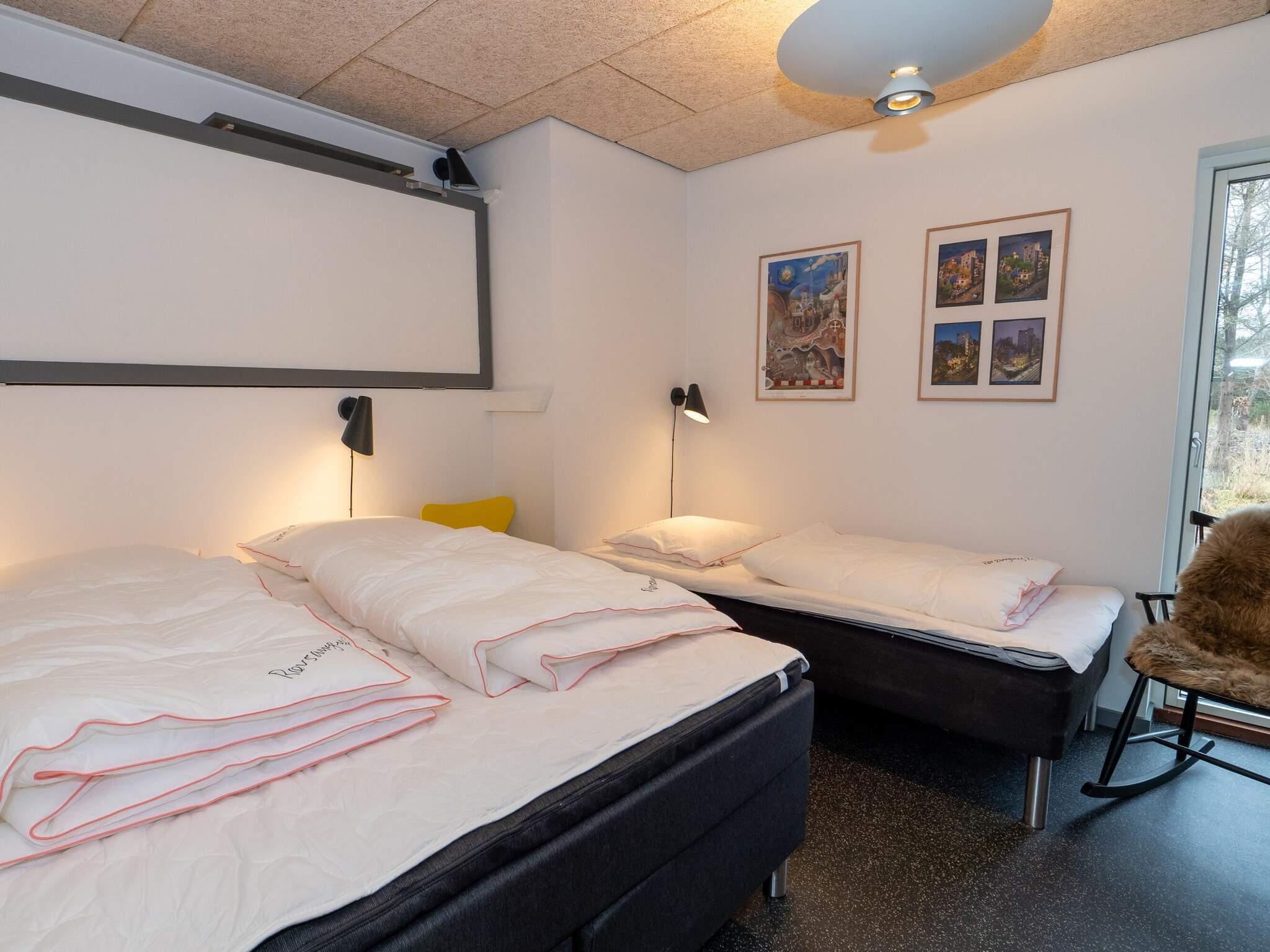 Ét soveværelse med dobbeltseng, én enkeltseng og en overkøje – perfekt til familier med børn.