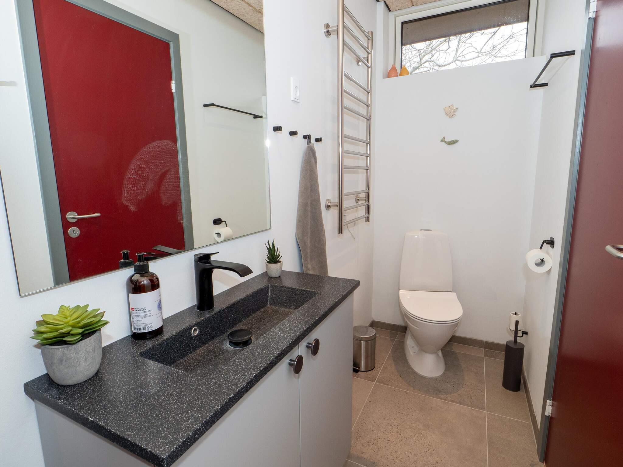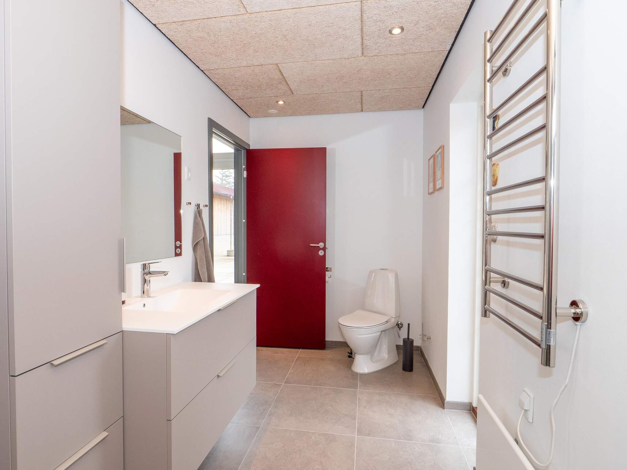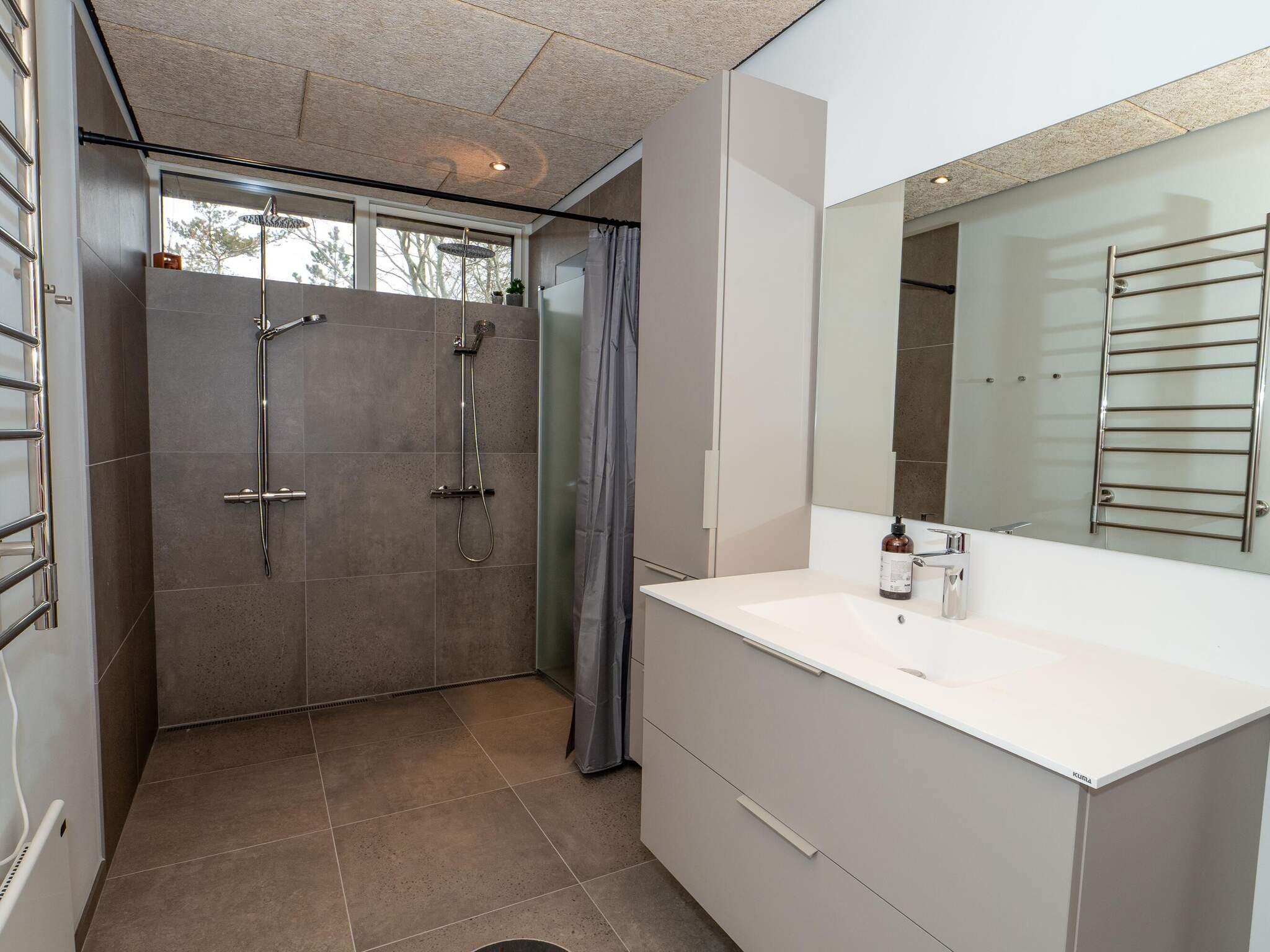 Der er to badeværelser – det ene med bruser, wc, håndvask og gulvvarme, og det andet med dobbeltbruser, wc, håndvask, gulvvarme samt vaskemaskine.