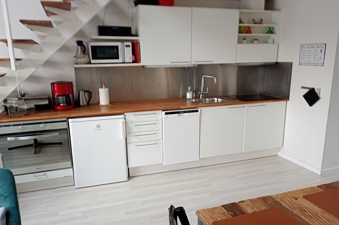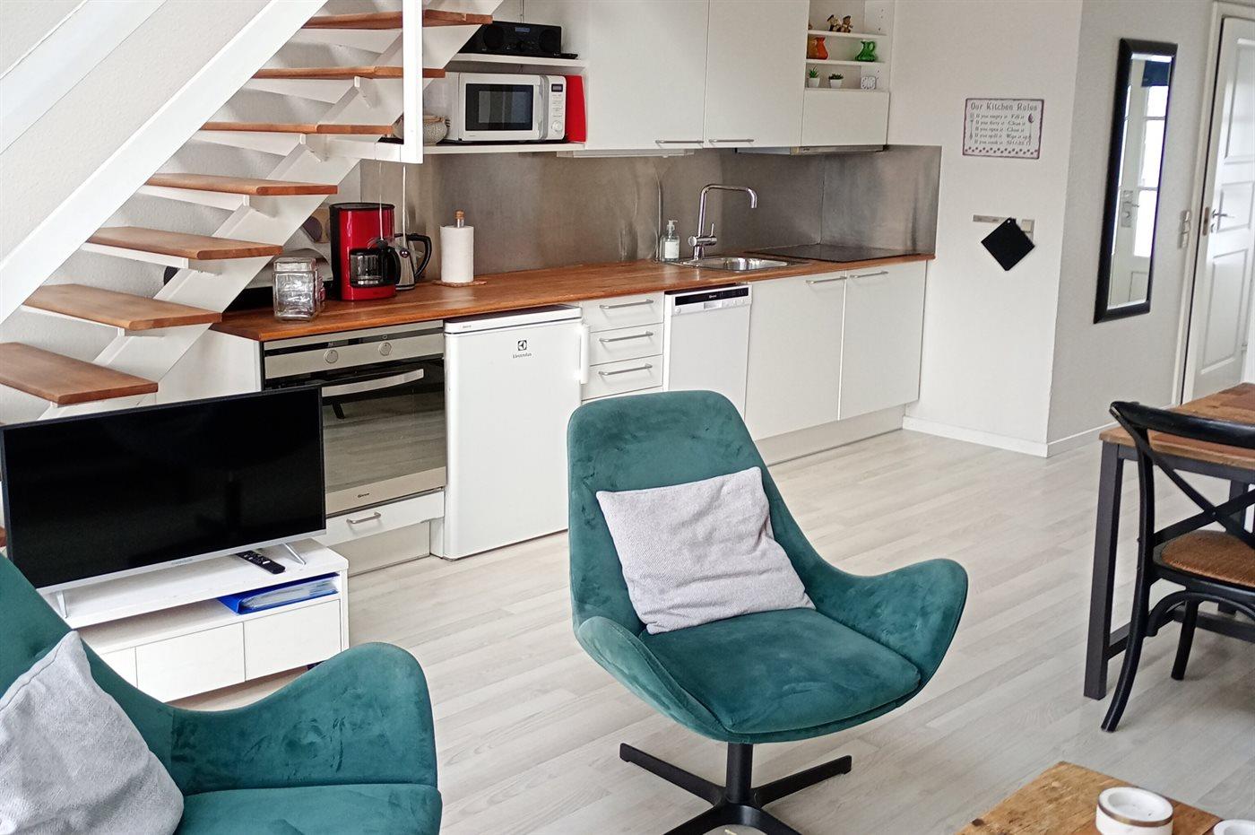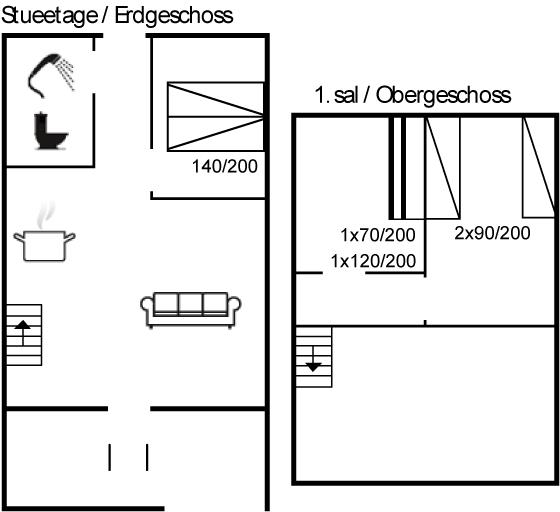 Badeværelse med bruseniche. Til de mindste feriegæster findes der barneseng og høj barnestol. Overalt i lejligheden er der tapetserede vægge og trælofter samt trægulve. Til hver bolig hører en delvis afskærmet, sydvendt terrasse med havemøbler.