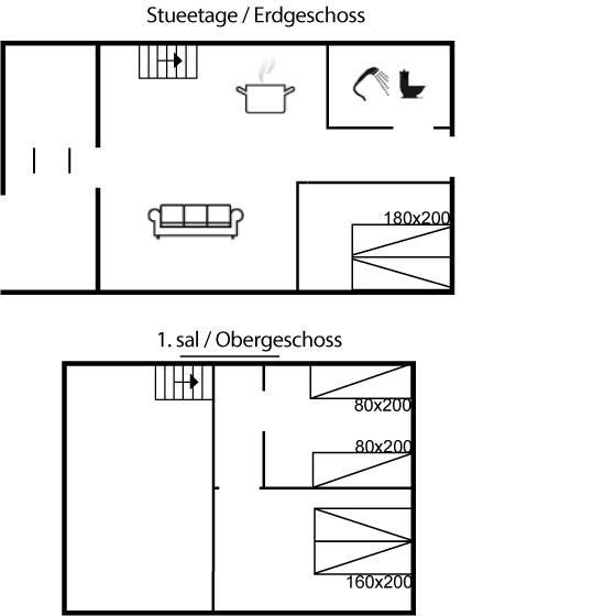 Der er i alt 3 soveværelser. Sovepladserne fordeler sig på: 2 sovepladser i dobbeltseng. 4 sovepladser i enkeltsenge. Derudover er der 1 stk. barneseng.