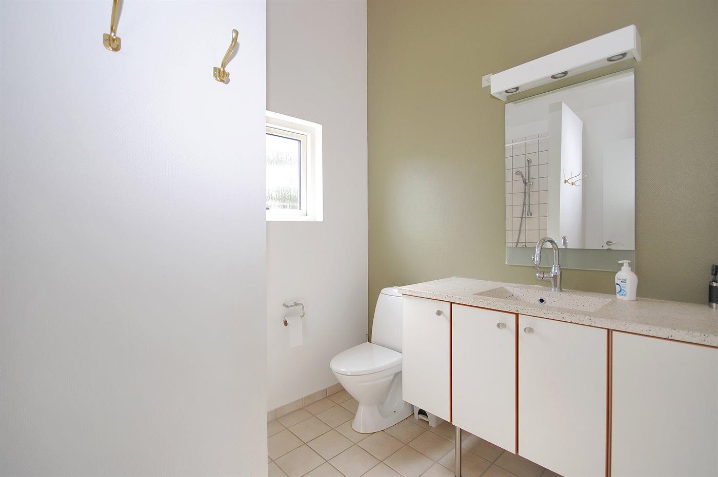 Der er 1 badeværelse med bruseniche og 2 toiletter, heraf 1 gæstetoilet. Der er gulvvarme på 1 badeværelse.