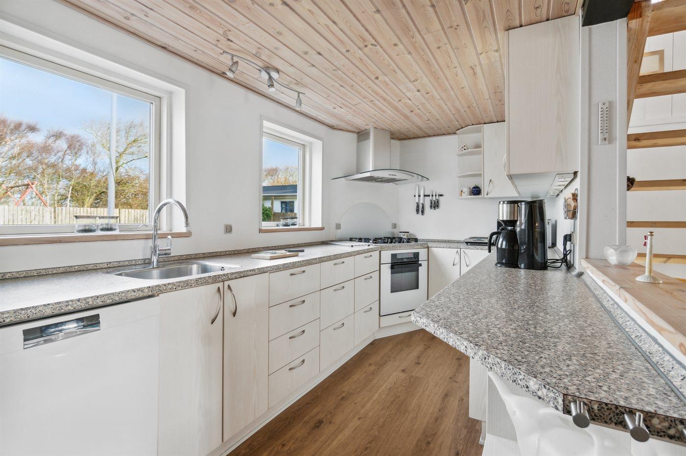 Køkkenet er udstyret med 1 køleskab. Der er 5 gasblus, bageovn, mikrobølgeovn samt opvaskemaskine.