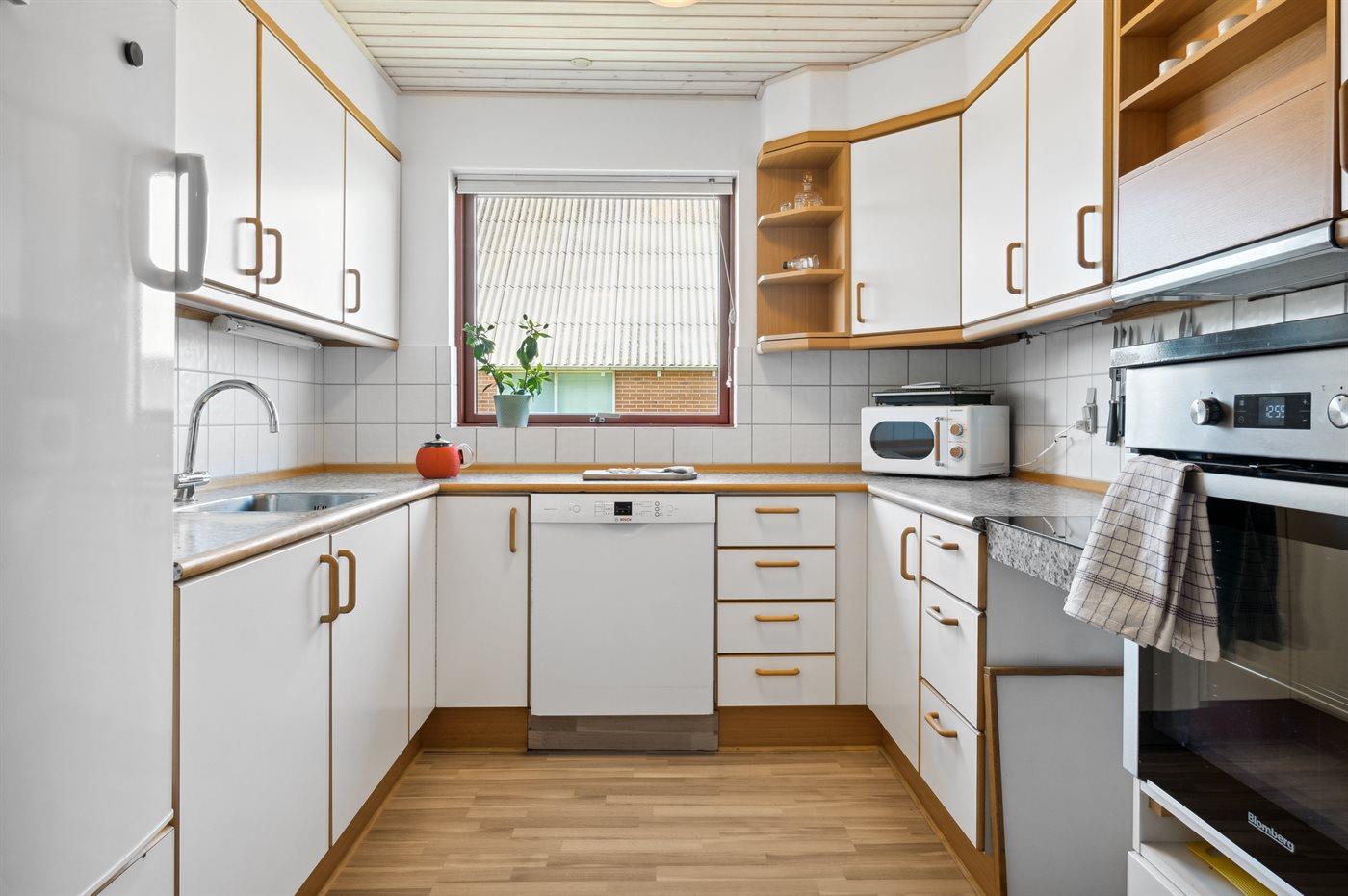 Køkkenet er udstyret med 1 køleskab. Der er 4 keramiske kogeplader, varmluftovn, mikrobølgeovn samt opvaskemaskine.