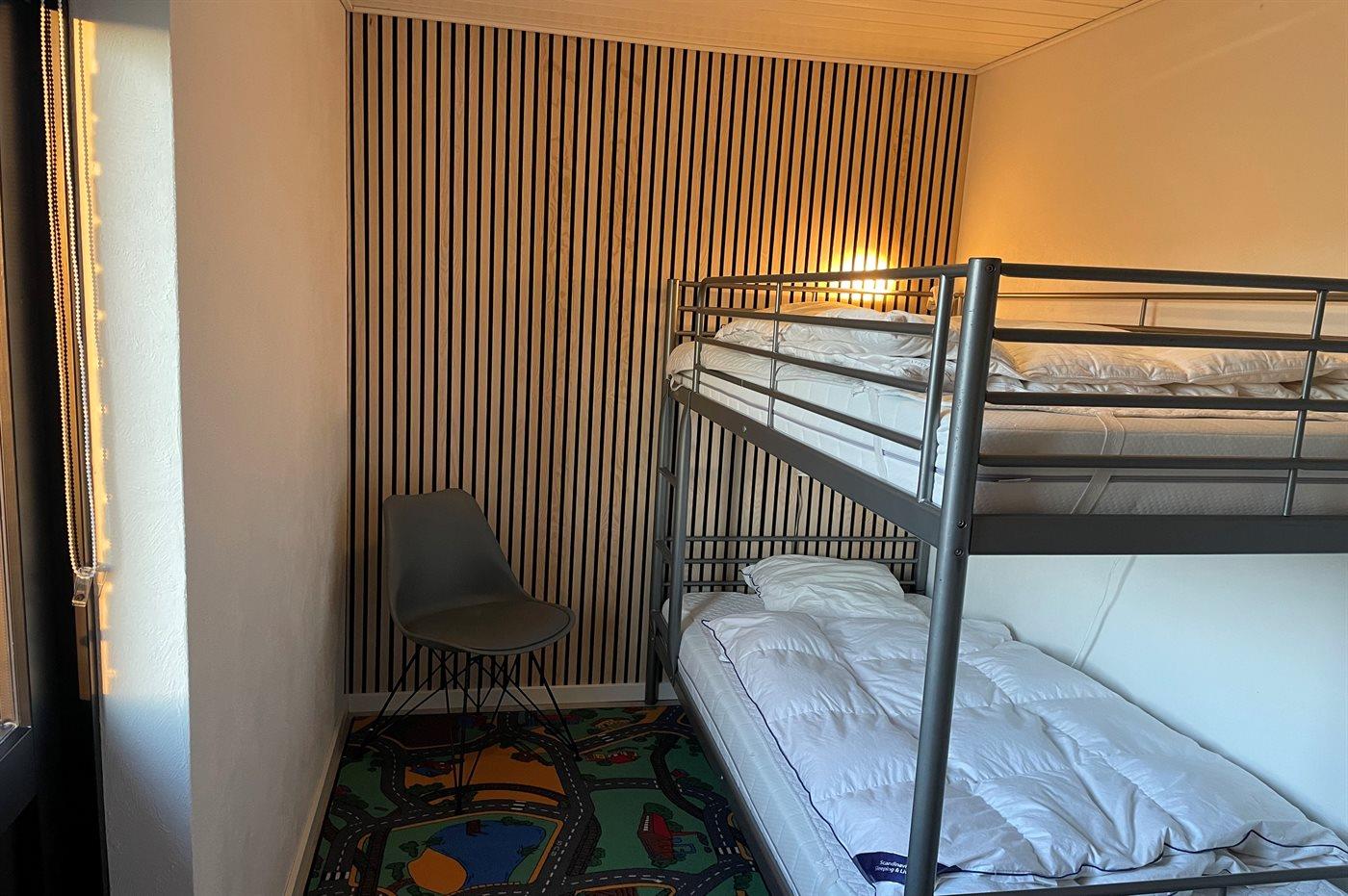 Der er i alt 5 soveværelser. Sovepladserne fordeler sig på: 4 sovepladser i dobbeltsenge. 2 sovepladser i enkeltsenge. 4 sovepladser i køjesenge. Derudover er der 1 stk. barneseng.