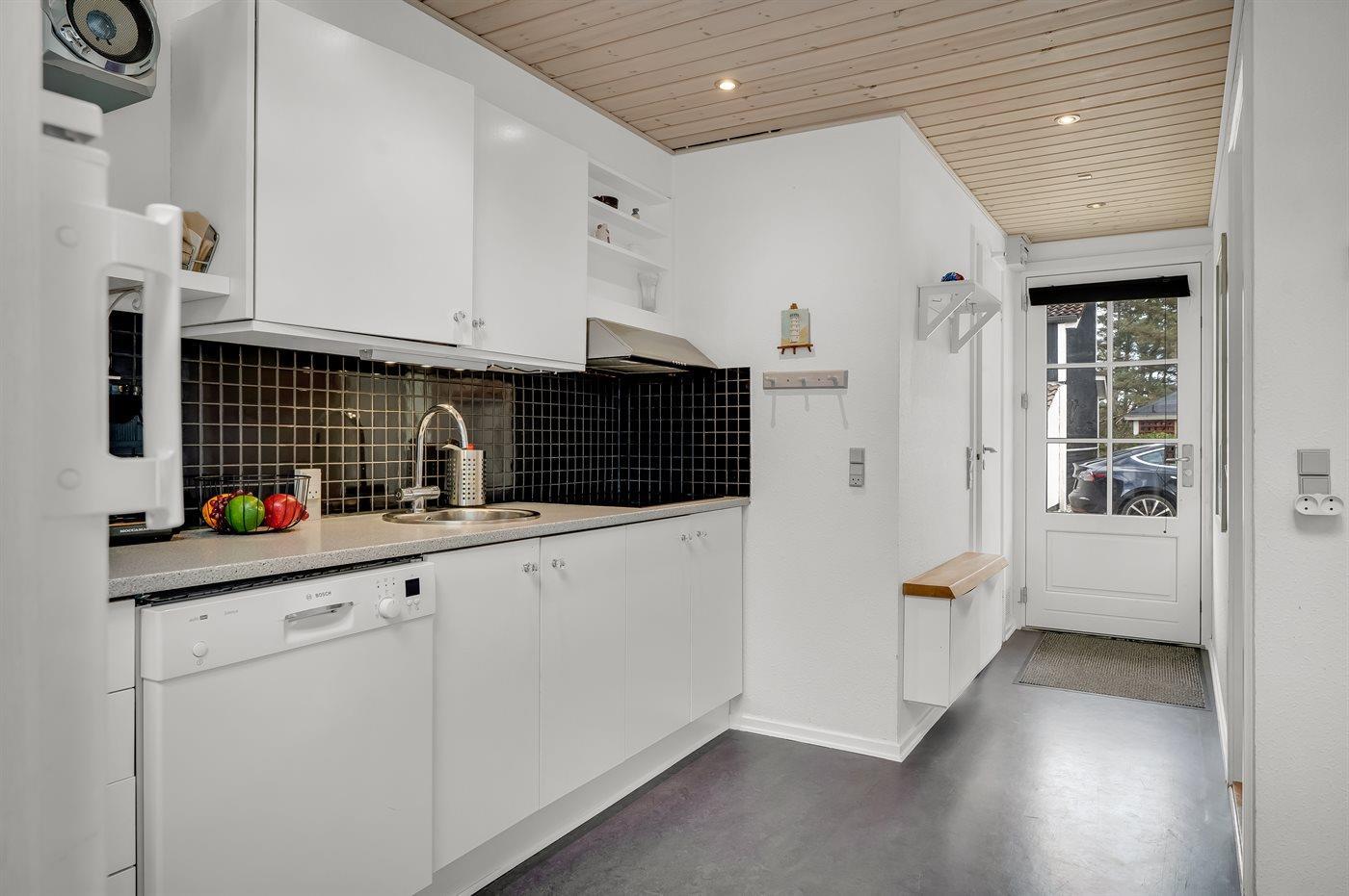 Køkkenet er udstyret med 1 køleskab. Der er 4 elkogeplader, varmluftovn samt opvaskemaskine.