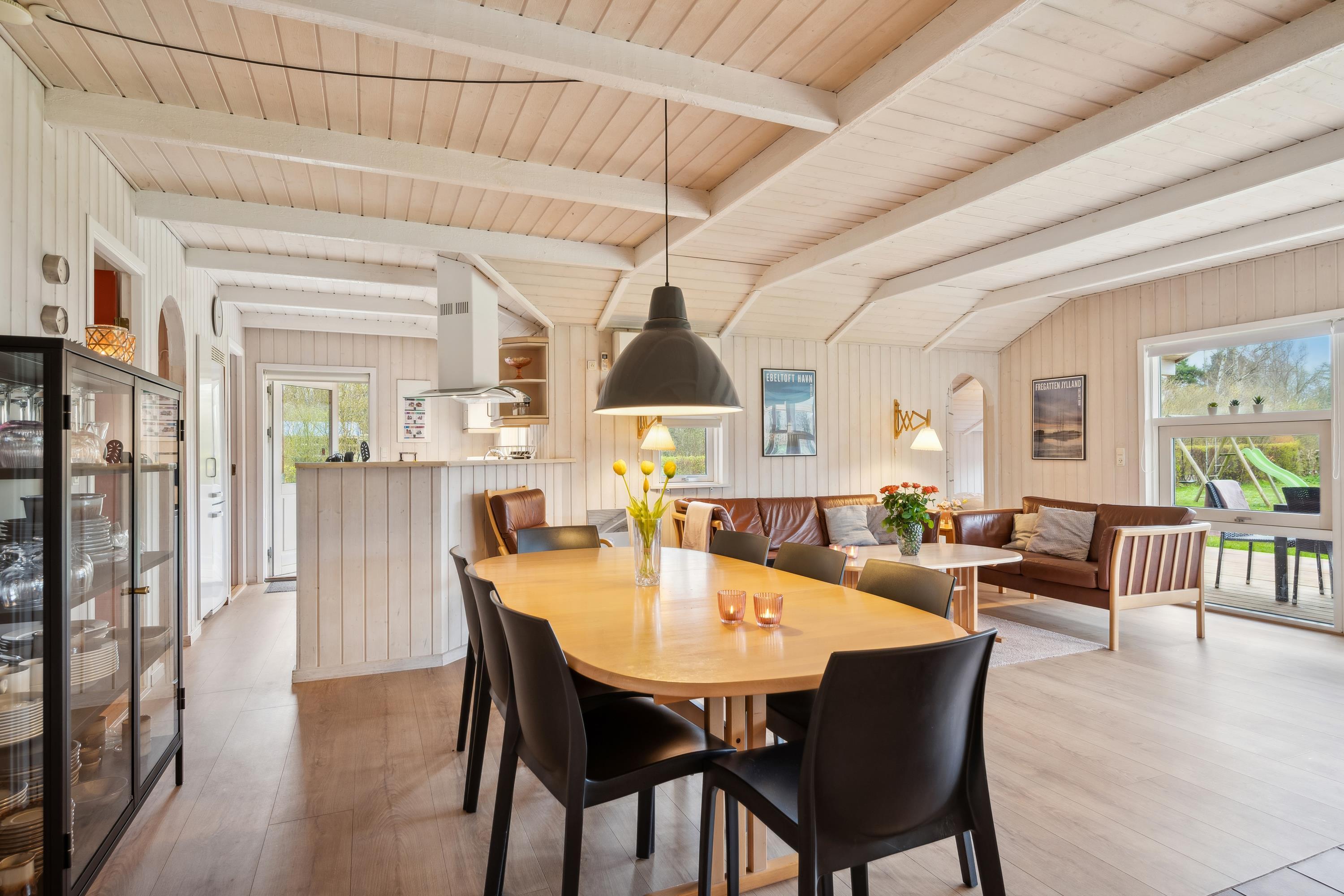 Ikke langt fra Ebeltoft by og tæt på en god badestrand finder man dette velholdte hus. Huset indeholder en hyggelig lys og velmøbleret stue med brændeovn og varmepumpe og med udgang til en skøn overdækket terrasse. I forbindelse med stuen ligger det veludstyrede køkken med b.la. opvaskemaskine samt en god spiseafdeling. Husets sovepladser fordeler sig på 4 gode soveværelser, heraf tre værelser med dobbeltsenge og et værelse med to enkeltsenge. Dejligt badeværelse med spa-bad og adgang til husets sauna samt et gæstetoilet med håndvask. Til de små feriegæster er der en høj stol samt en barneseng. I redskabsskur ved huset er der både vaskemaskine og tørretumbler som kan benyttes. Huset er omkranset af dejlig stor terrasse, hvoraf en del er overdækket.Udenfor er der også tænkt på de små feriegæster med gynger, sandkasse og rutschebane. Der er en dejlig stor græsplæne, velegnet til leg og boldspil samt udendørs hygge. Huset er beliggende i et meget børnevenligt område og 5 min gang fra en dejlig badestrand.
