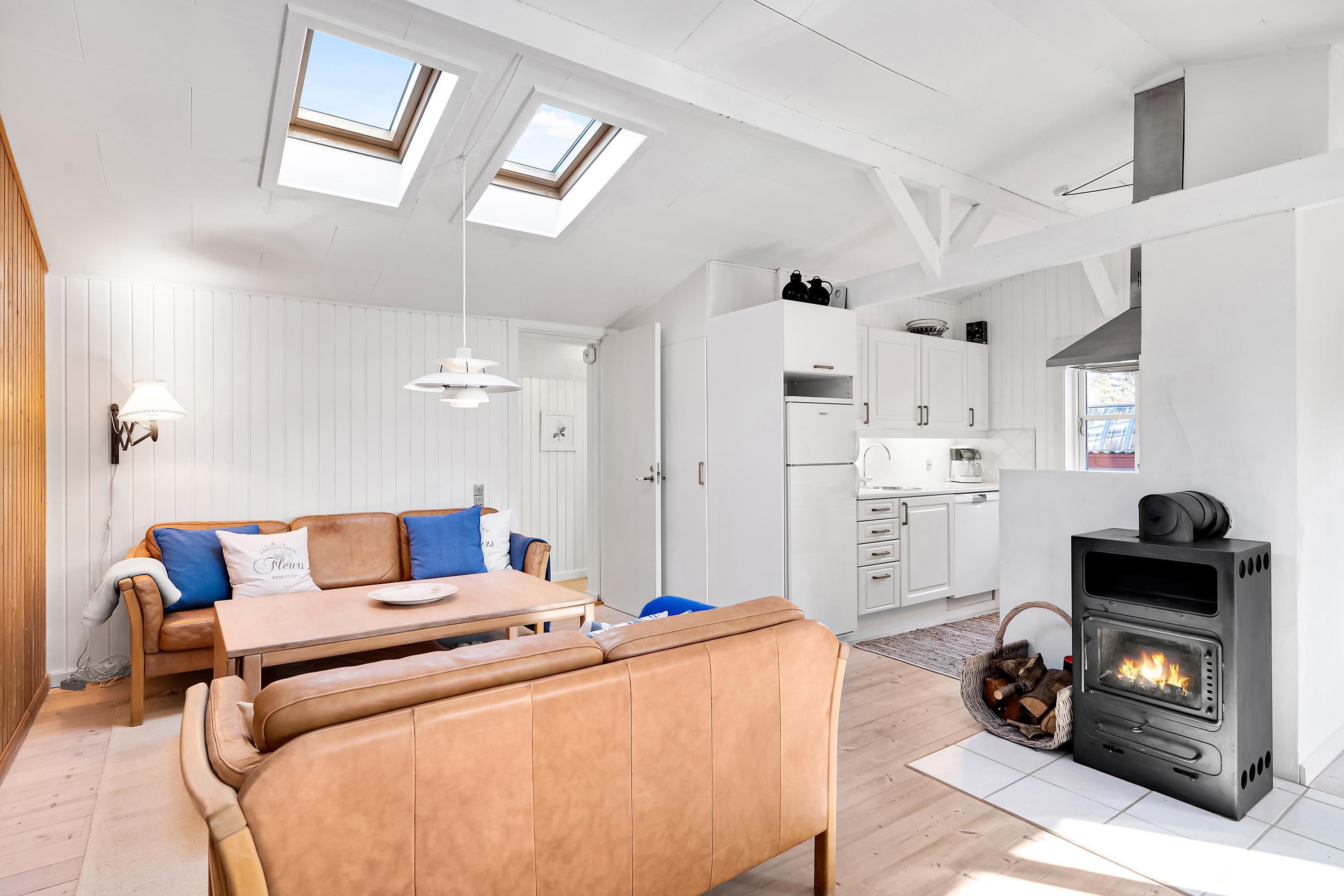 Den lyse og rummelige stue ligger i åben forbindelse med køkkenet og har lofter til kip med ovenlysvinduer. Her er brændeovn, spiseplads til 6 personer, TV med danske kanaler, DVD-afspiller, CD-afspiller og radio. Nyere og veludstyret køkken med keramisk komfur, ovn, køle-/fryseskab og opvaskemaskine. Husets 6 sovepladser fordeler sig på 2 gode soveværelser med dobbeltseng, 1 værelse med 1½-personers seng og 1 værelse med 1 enkeltseng. Desuden er der en hems med 2 springmadrasser. Lyst og dejligt badeværelse med bruseniche og gulvvarme. Et velplejet og smagfuldt indrettet hus med masser af hygge og atmosfære. Der er internetadgang.