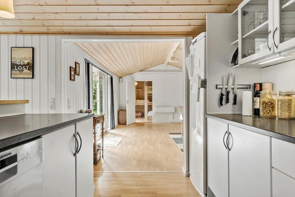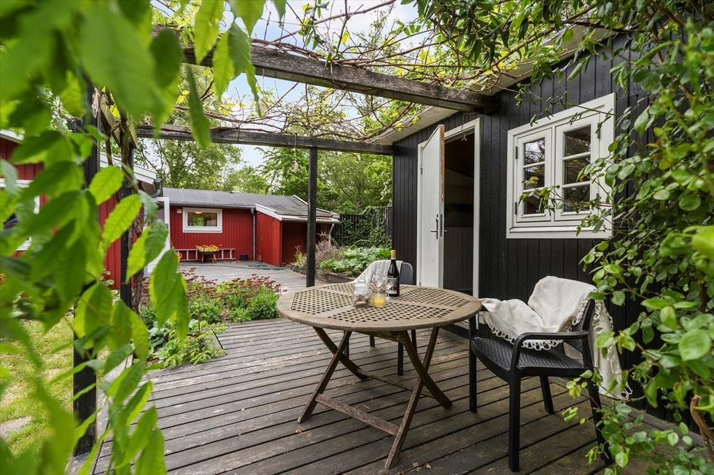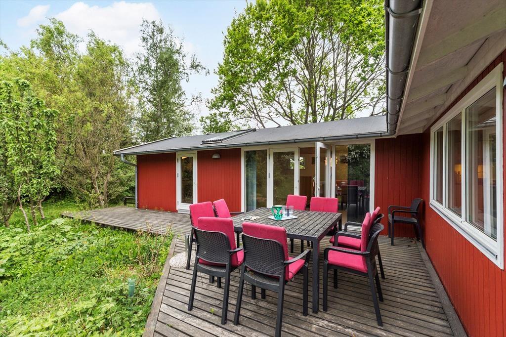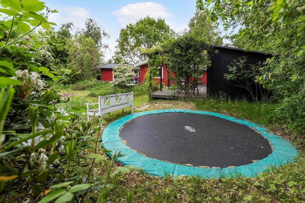 Huset ligger på en ugenert naturgrund på 2.300 m², kun 400 meter fra den børnevenlige Ahl Strand. Naturhaven har bålplads og trampolin og måske er du heldig at se rådyr i de tidlige morgentimer. Du kan nyde solrige dage på de øst- og vestvendte træterrasser, hvor der er havemøbler, parasol og grill til rådighed – perfekt til afslapning og udendørs måltider.
