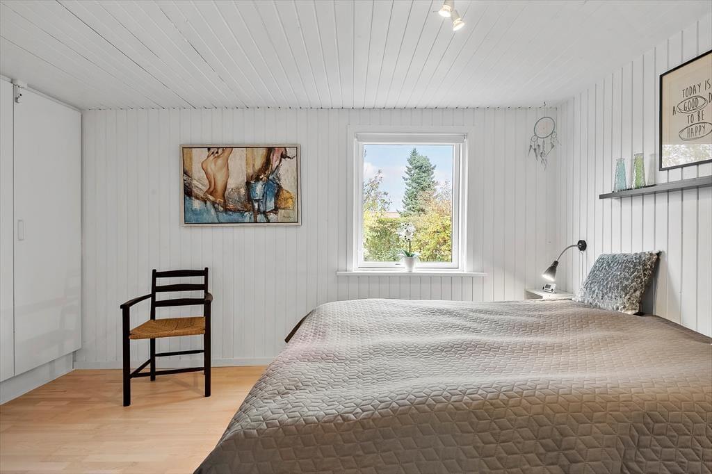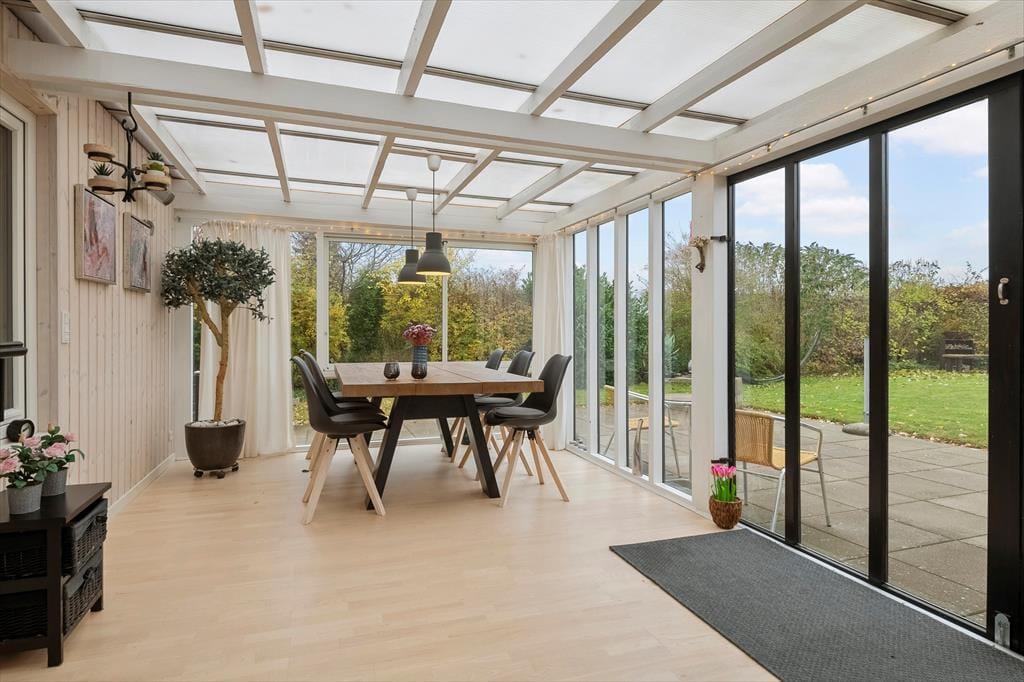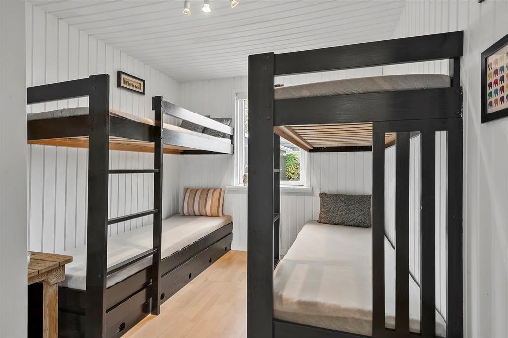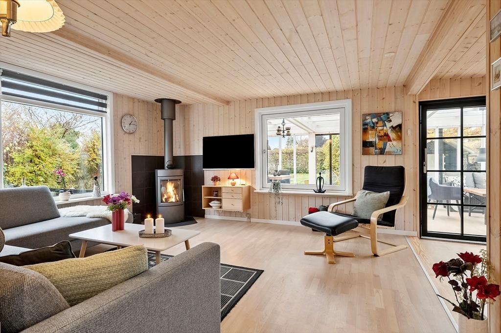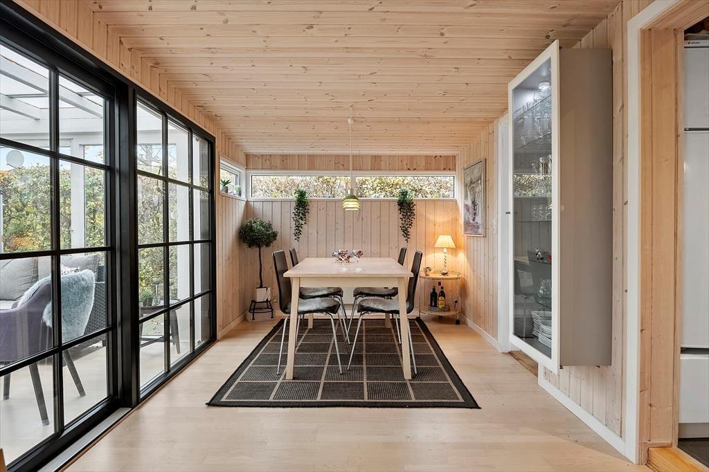 Indenfor møder du et lyst og indbydende sommerhus, hvor de store vinduespartier giver et naturligt lys og en fornemmelse af at have naturen tæt på, selv når du opholder dig inde. Havestuen fungerer som et blødt mellemrum mellem ude og inde, og den bliver hurtigt et sted, hvor I samles i løbet af dagen. Måske med en kop te, et godt spil, en hyggelig snak eller blot stille tid med en bog. Køkken og stue ligger i åben forbindelse med hinanden, så hverdagsrutiner falder naturligt ind i samværet. I de tre soveværelser er indretningen enkel og venlig, så du får den ro, du har brug for. Det er nemt at lande her og føle, at du hører til allerede fra første øjeblik.