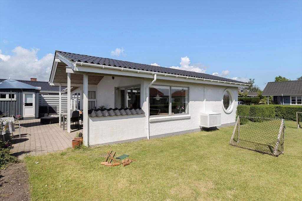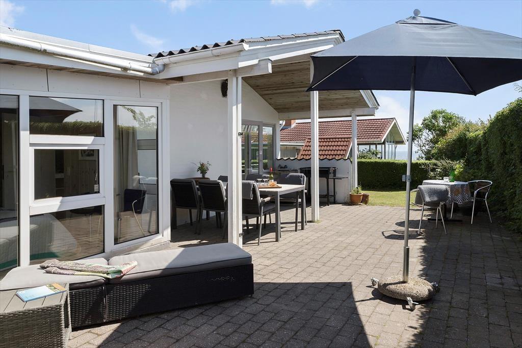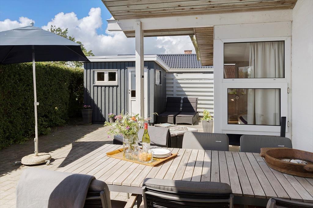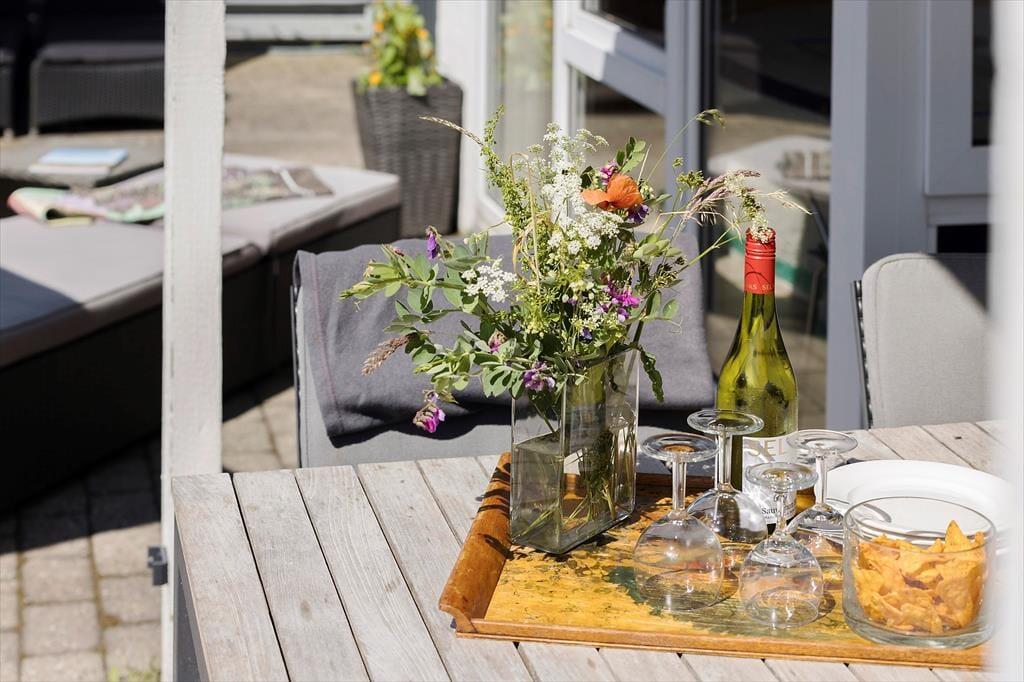 Udenfor breder terrassen sig ud mod haven, og her kan du finde din favoritplads i solen fra morgen til aften. Nyd den første kop kaffe med havet i horisonten, eller lad grillen blive tændt, mens aftensolen maler himlen i gyldne farver. Den grønne have indbyder til afslapning, leg og rolige øjeblikke, hvor du mærker feriepulsen sænke sig. En kort gåtur fører dig ned til stranden, hvor du kan dyppe tæerne i vandet, samle skaller eller blot nyde udsigten over det åbne hav. Selv på dage med frisk vind er det en oplevelse at gå langs kysten og mærke naturens kræfter på tæt hold.