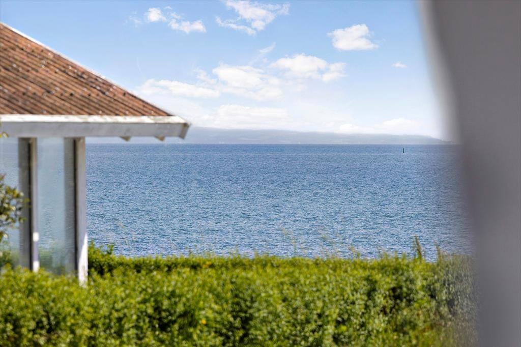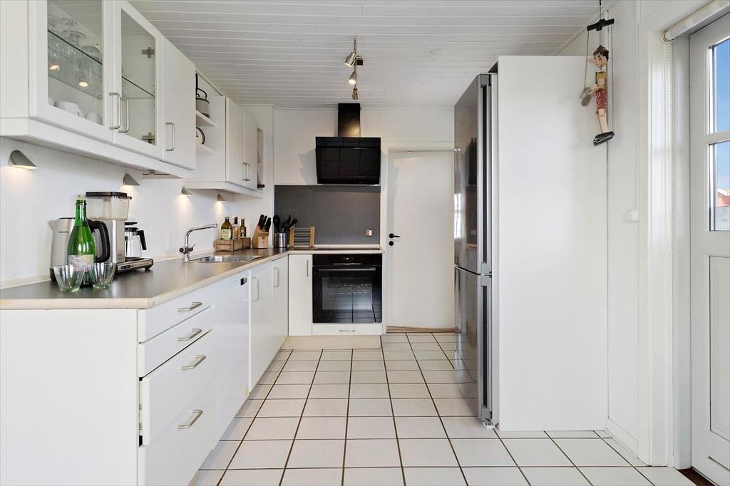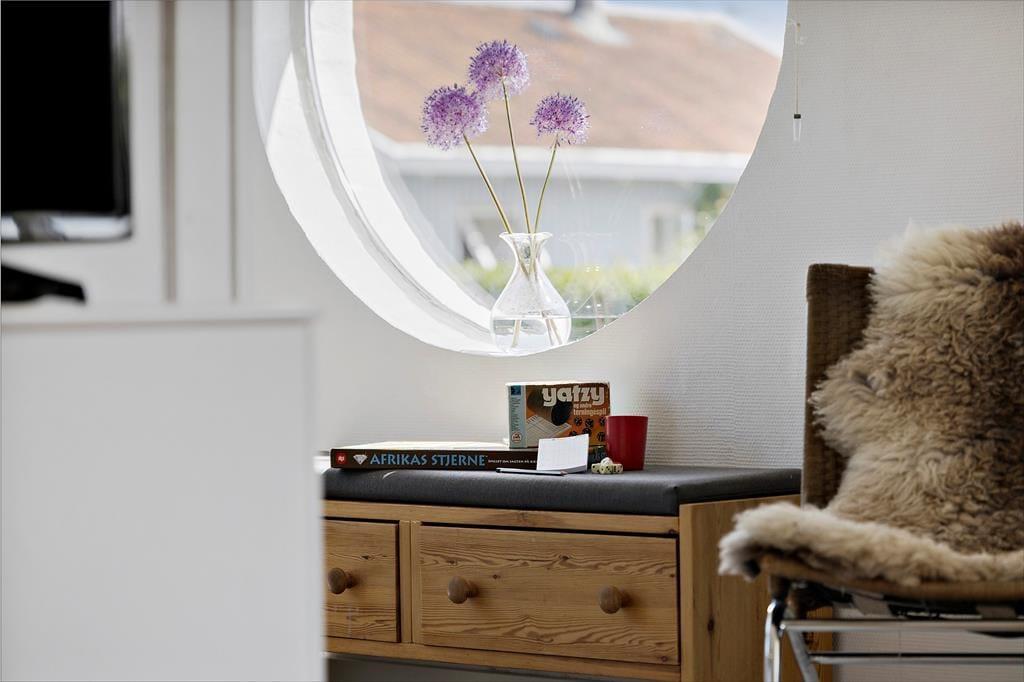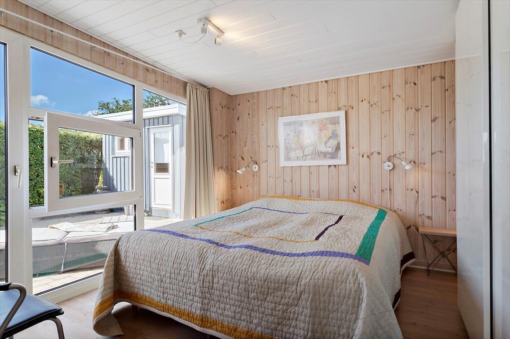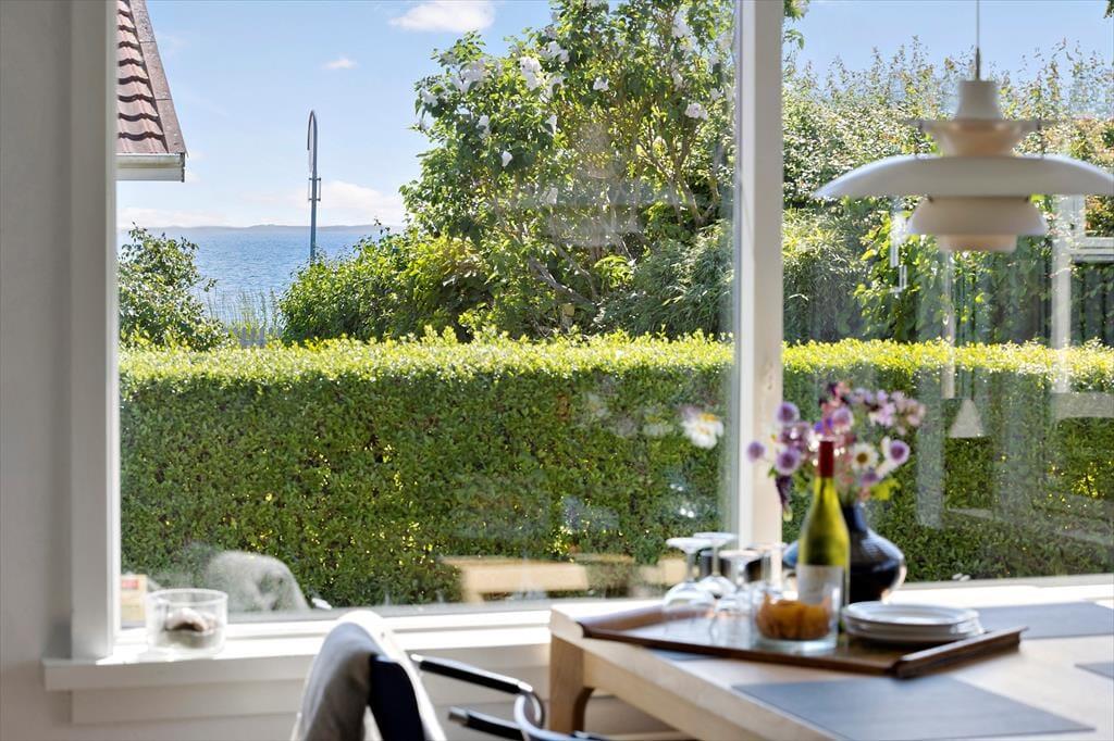 Indenfor mødes du af en lys og venlig atmosfære, hvor store vinduer åbner mod havet og lader dagslyset strømme ind i rummene. Stuen er indrettet i rolige farver og med en behagelig stemning, der gør det let at falde til. Her kan du læne dig tilbage med en god bog, nyde varmen fra brændeovnen eller samles til en hyggelig aften. Køkkenet ligger i åben forbindelse med stuen, så samtalerne kan fortsætte, mens maden tilberedes, og feriens rytme finder sit eget naturlige tempo. Det er et sted, hvor hverdagens travlhed forsvinder, og hvor du får tid til bare at være.