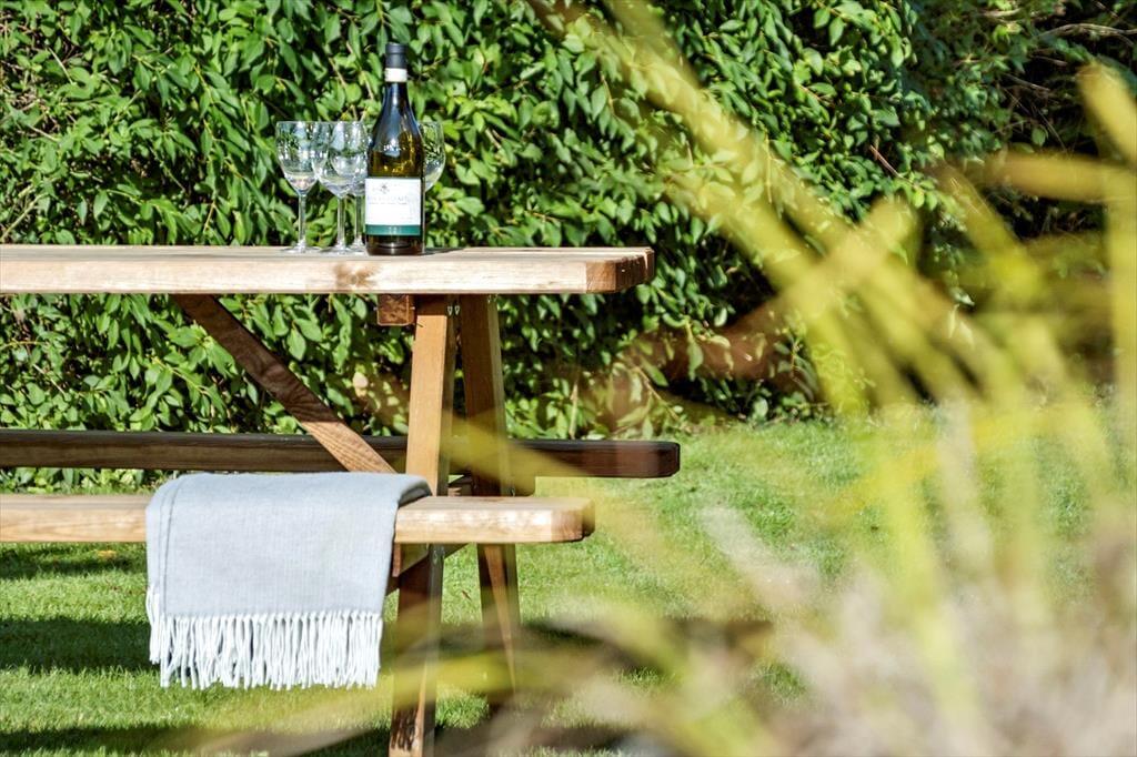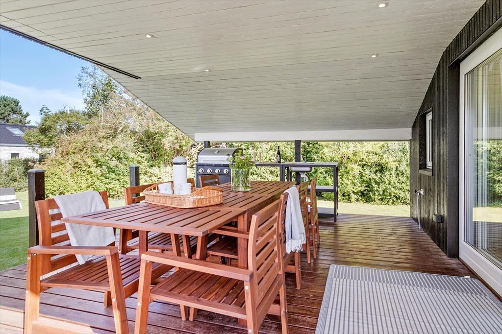 Udenfor venter terrassen som et naturligt samlingspunkt fra dagens første kop kaffe til de sidste aftentimer under åben himmel. Her kan du mærke den friske havluft, nyde solen, finde skygge eller gå en tur til stranden med sand under fødderne. Den brede sandstrand ligger kun få skridt væk og inviterer både til små dyp, lange gåture og stille stunder, hvor du bare følger bølgernes rytme. Dagen kan tilbringes med spil, afslapning eller små ture langs vandet, og når solen går ned, kan I samle jer på terrassen, dele dagens oplevelser og lade feriestemningen folde sig helt ud.