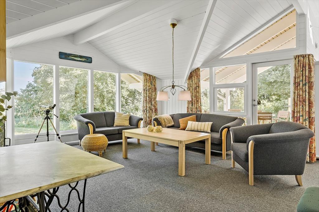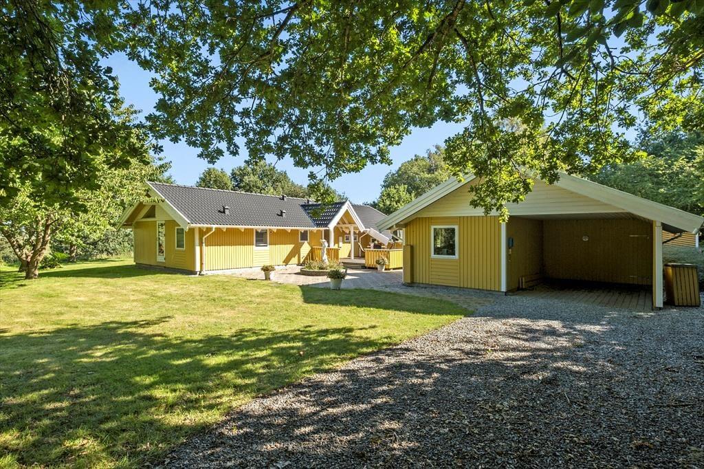 Når vejret er med jer, er det fristende at tilbringe størstedelen af ferien ude i det fri på den 1865 m2 store naturgrund. Flotte træer skærmer udearealerne godt af, og mod øst er der dog mere åbent, så I virkelig kan nyde fjordudsigten og det vidtstrakte landskab. Omkring huset er der terrasser mod både syd og vest, og her kan I vælge mellem både åbne og overdækkede arealer alt efter, om I foretrækker at sidde i sol eller skygge. Til børnene er der gynge og en god græsplæne at lege på, og bilen kan enten holde i carporten eller indkørslen.