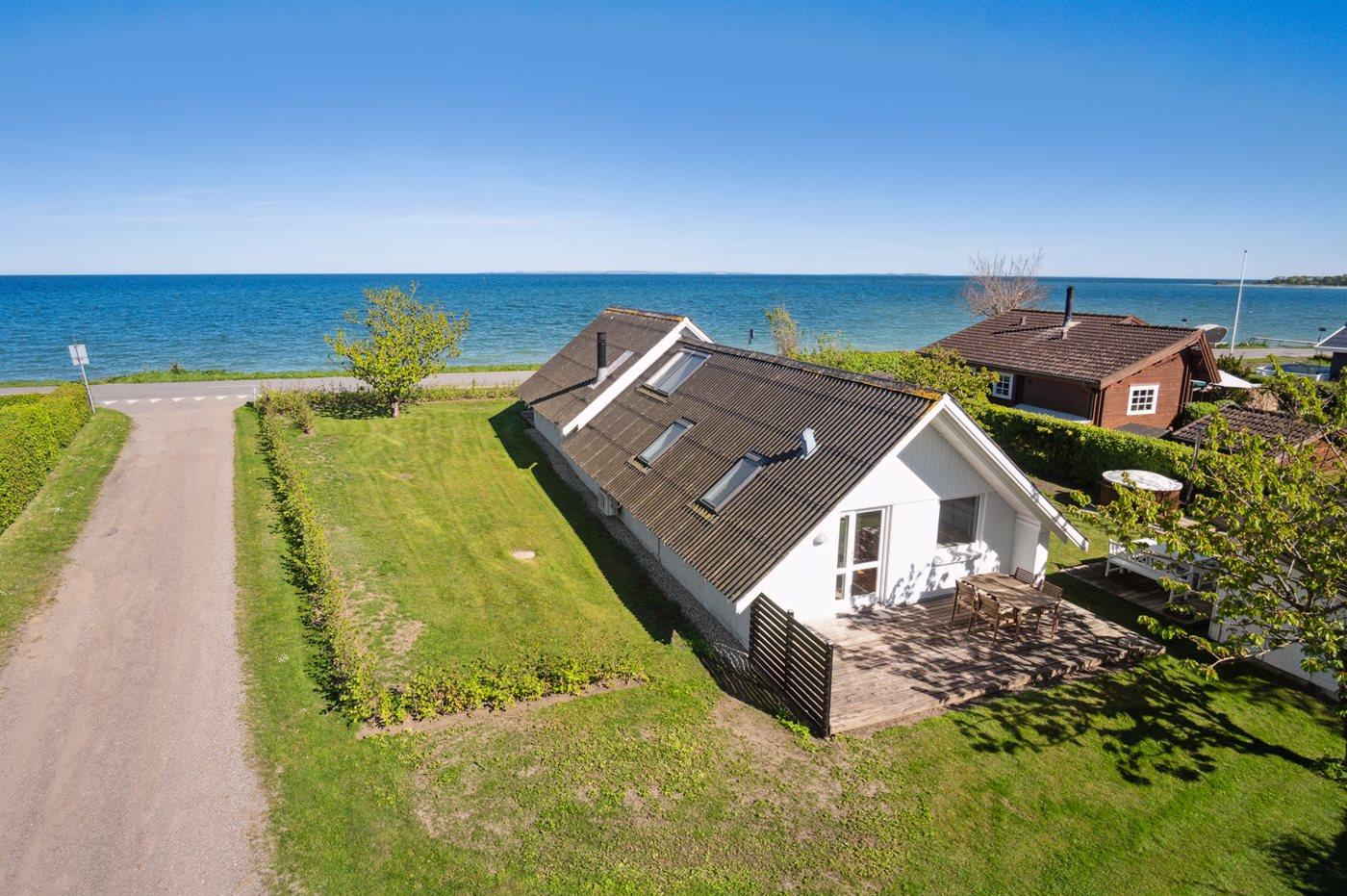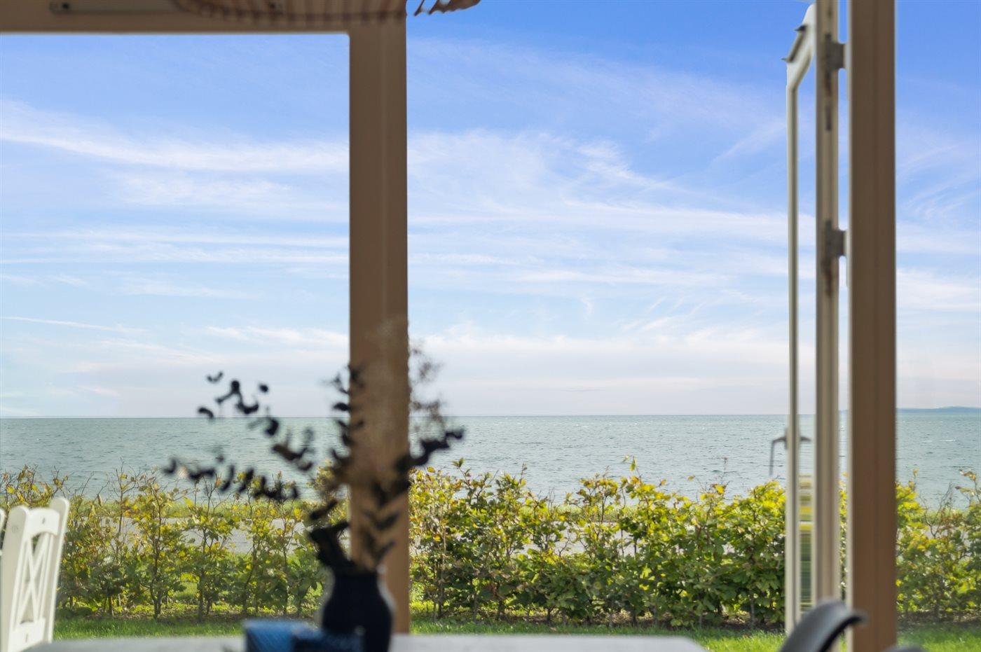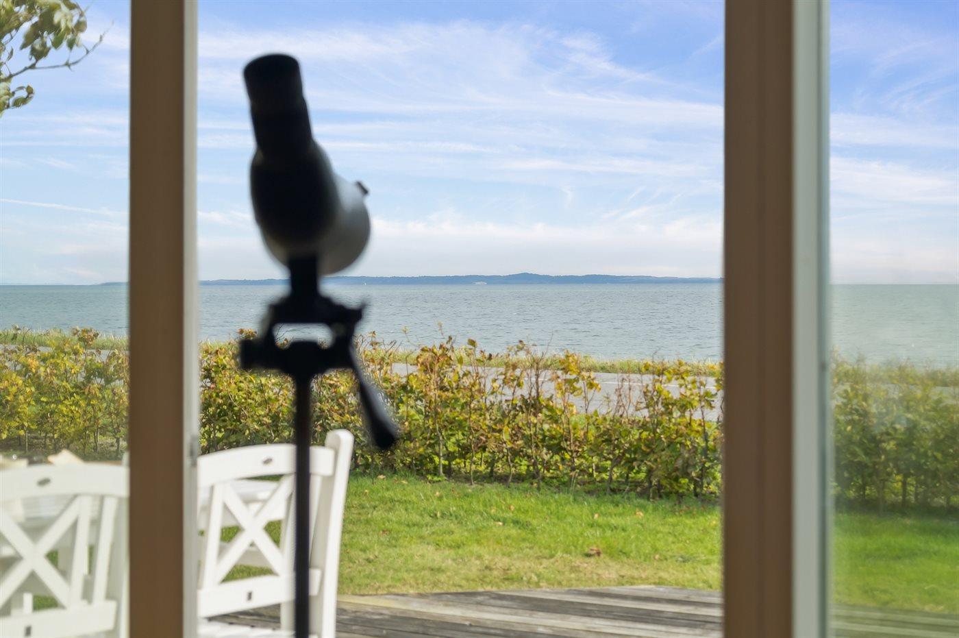 Der er 180 graders panoramaudsigt over vandet og det er svært, at løsrive sig fra dette syn. Dette gælder både fra det skønne terrasseareal, som findes foran huset direkte imod vandet og på siden af huset hvor der således altid er mulighed at finde en plads med læ. Også inde fra sommerhuset er udsigten fantastisk.