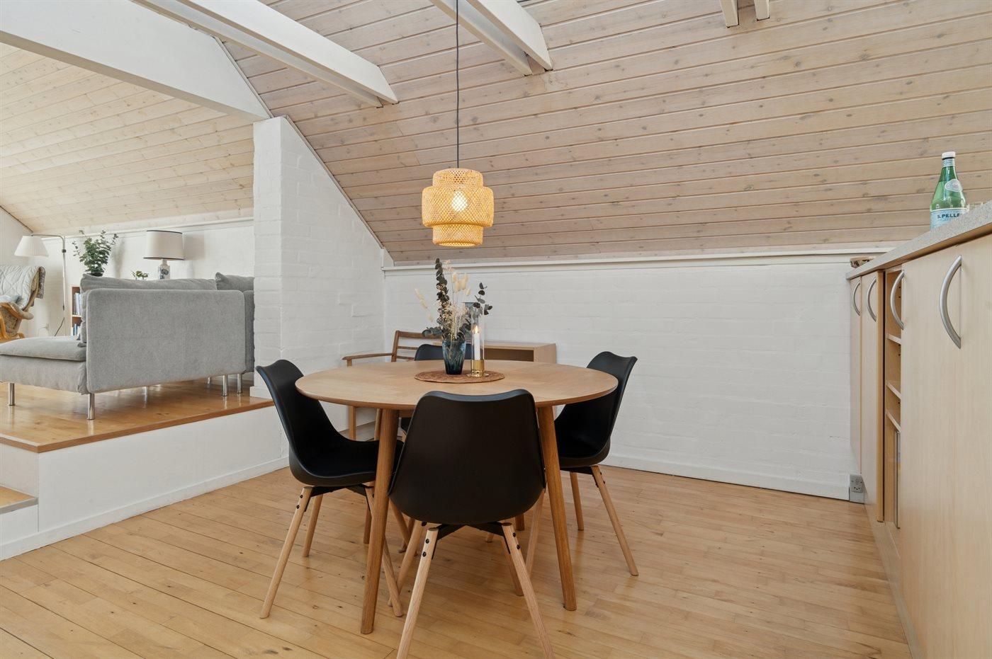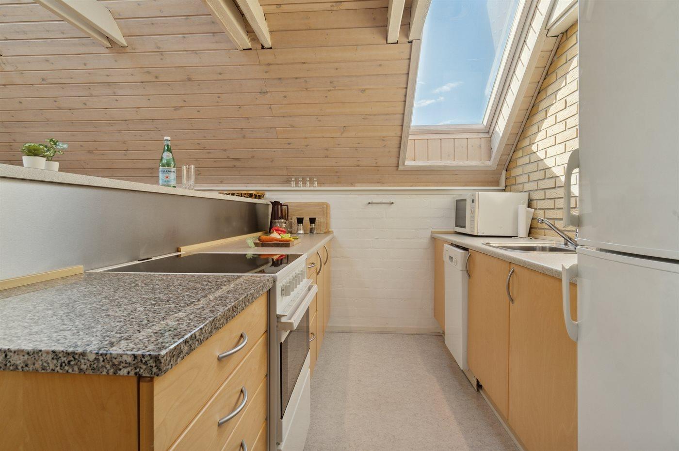 Køkkenet er udstyret med 1 køleskab. Der er 4 keramiske kogeplader, varmluftovn, mikrobølgeovn samt opvaskemaskine.